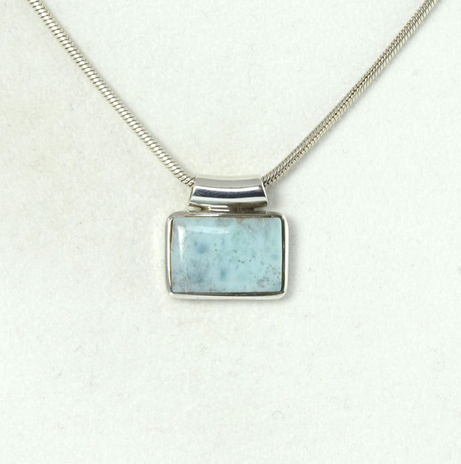 Pastellig blauer, rechteckiger Larimar-Anhänger mit feiner Zeichnung, quer eingefasst in Sterling Silber. Dieser Larimar-Anhänger ist ein Unikat.