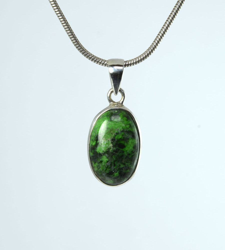 Leuchtend grüner Maw-Sit-Sit-Anhänger mit ovalem Cabochon. Der Stein hat eine kräftige Farbe mit lebendiger Zeichnung und ist in Sterling Silber eingefasst. Dieser Maw-Sit-Sit-Anhänger ist ein Unikat.
