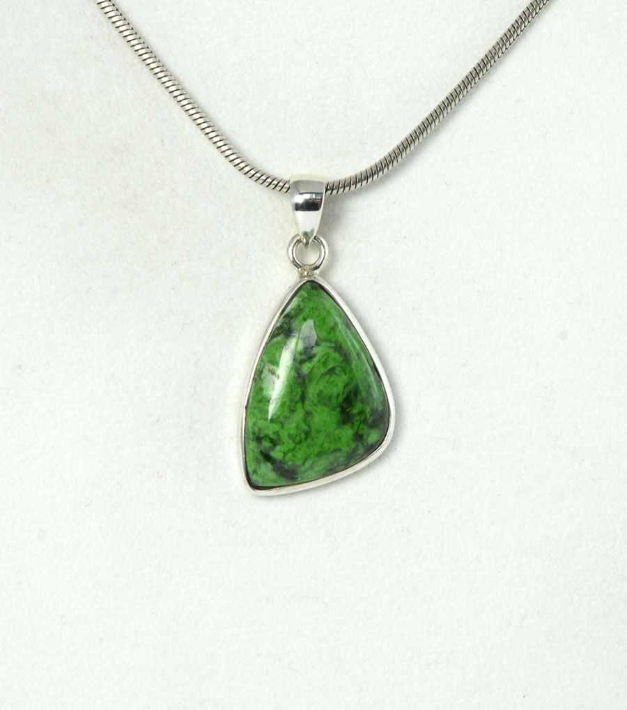 Ausgefallener Maw-Sit-Sit-Anhänger mit asymmetrisch geformtem Cabochon. Der Stein hat eine leuchtend grüne Farbe mit feiner Zeichnung und ist in Sterling Silber eingefasst. Dieser Maw-Sit-Sit-Anhänger ist ein Unikat.