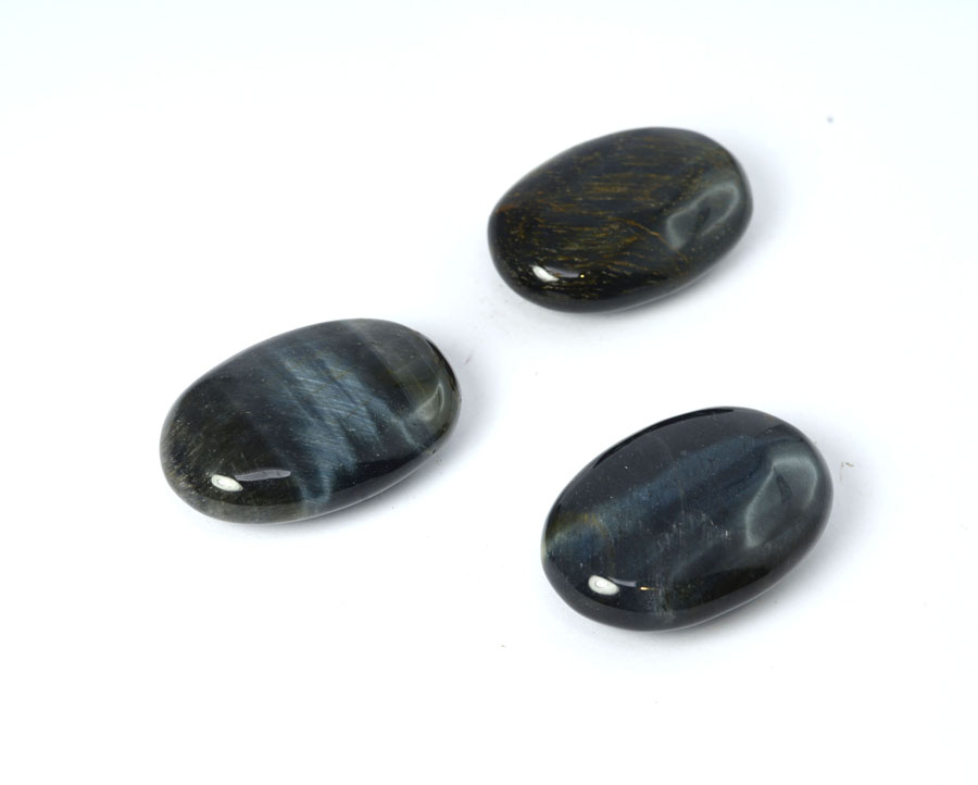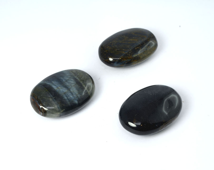 Seidig, dunkelblau schimmernder Falkenauge-Linsenstein. Der Linsenstein liegt durch seinen flachen ovalen Schliff prima in der Hand und eignet sich auch zum Tragen in der Hosentasche.