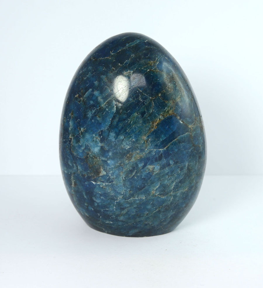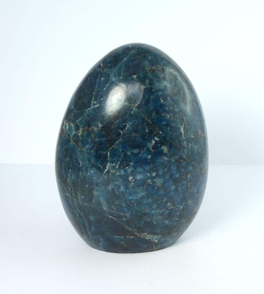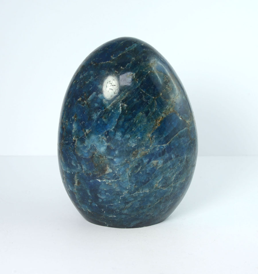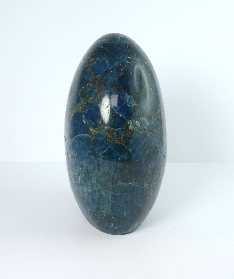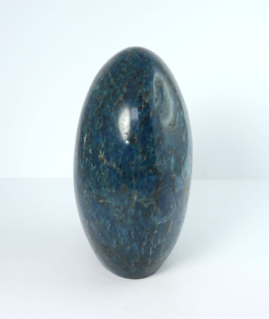 Großer, polierter Apatit mit Standfläche. Dieser kräftig blaue Apatit mit seidigem Glanz eigent sich gut zur Meditation oder als Dekostück. Dieser Apatit ist ein Unikat.