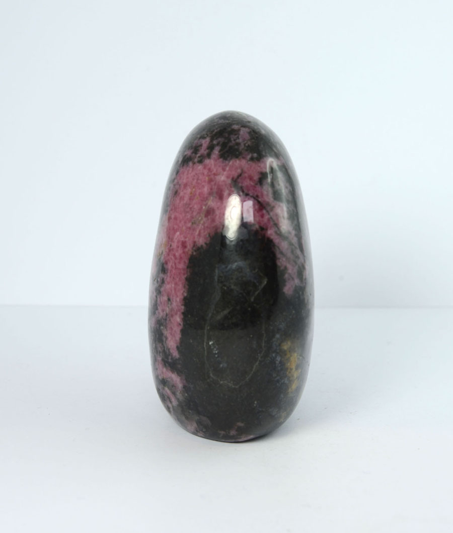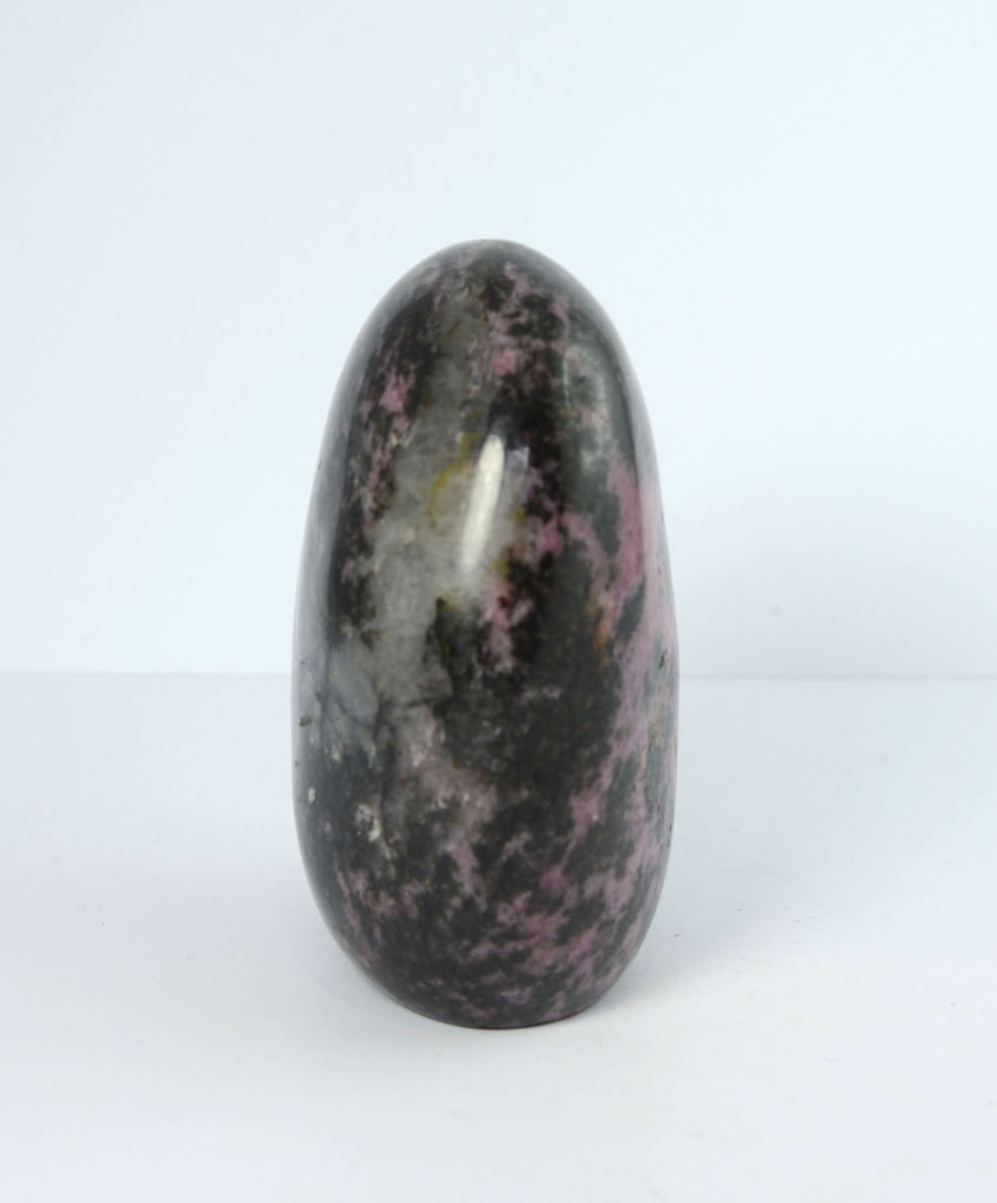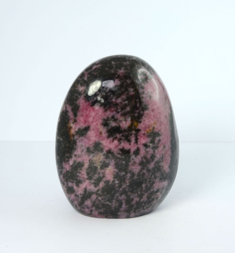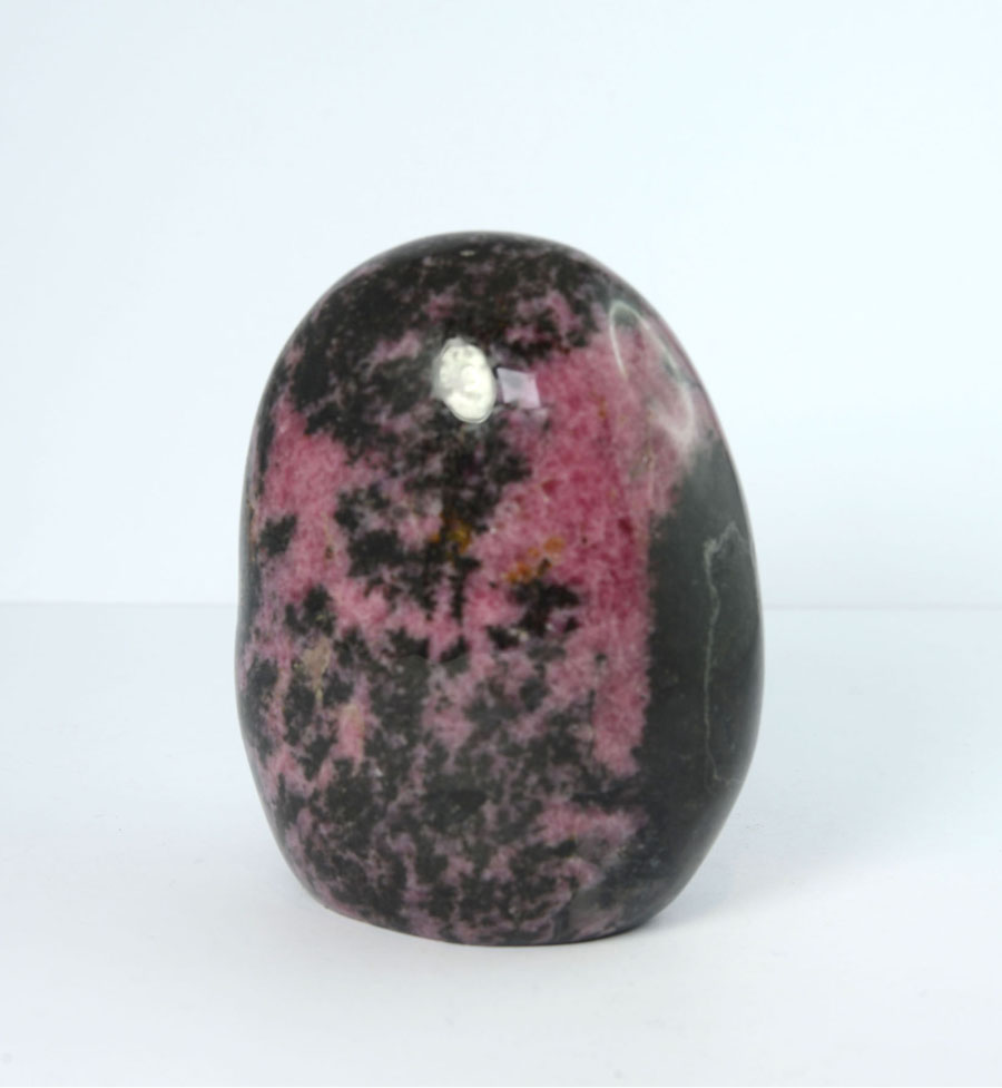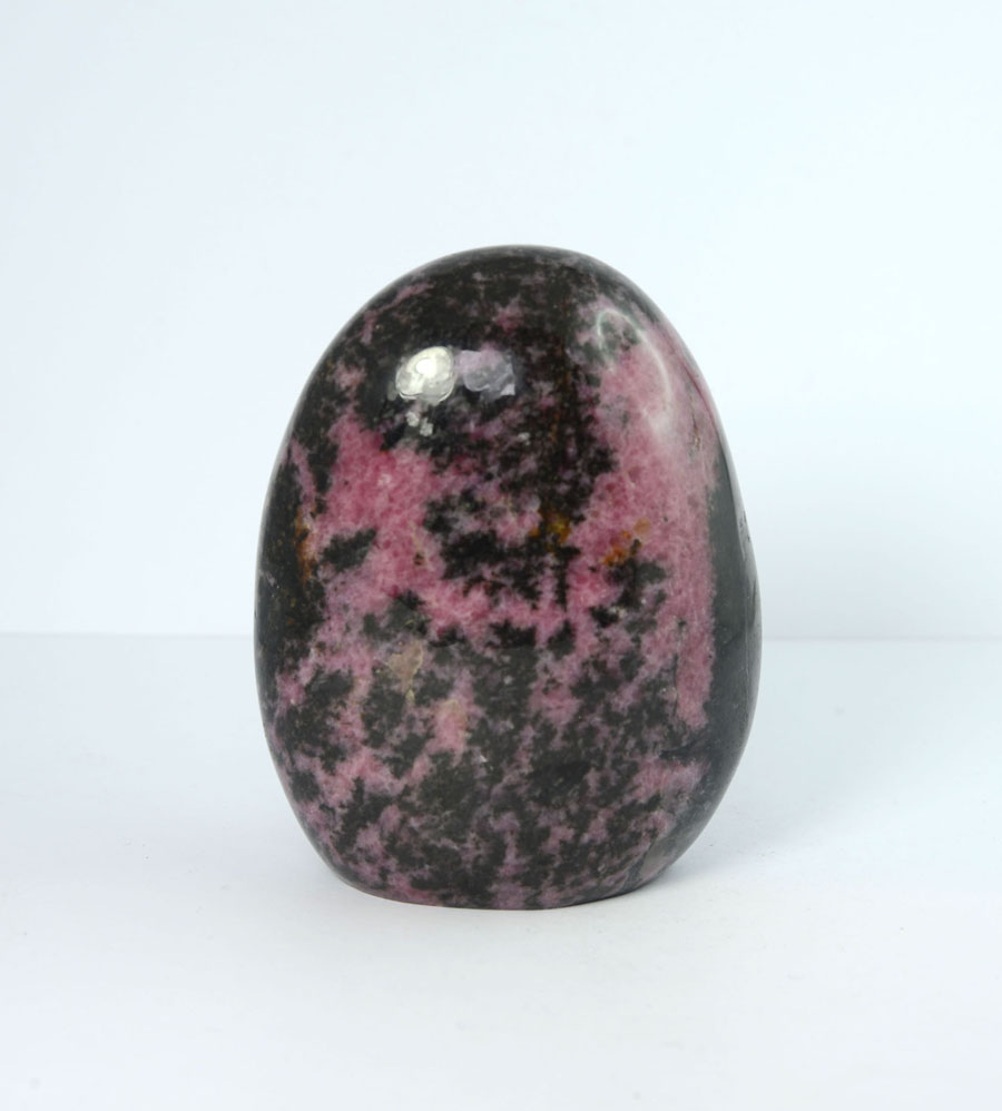 Mittelgroßer und leuchtend rosa Rhodonit-Anschliff mit lebendiger Zeichnung. Der Rhodonit ist vollständig poliert und hat eine gesägte Standfläche. Dieser Rhodonit-Anschliff ist ein Unikat.