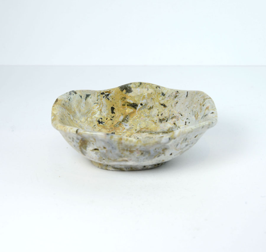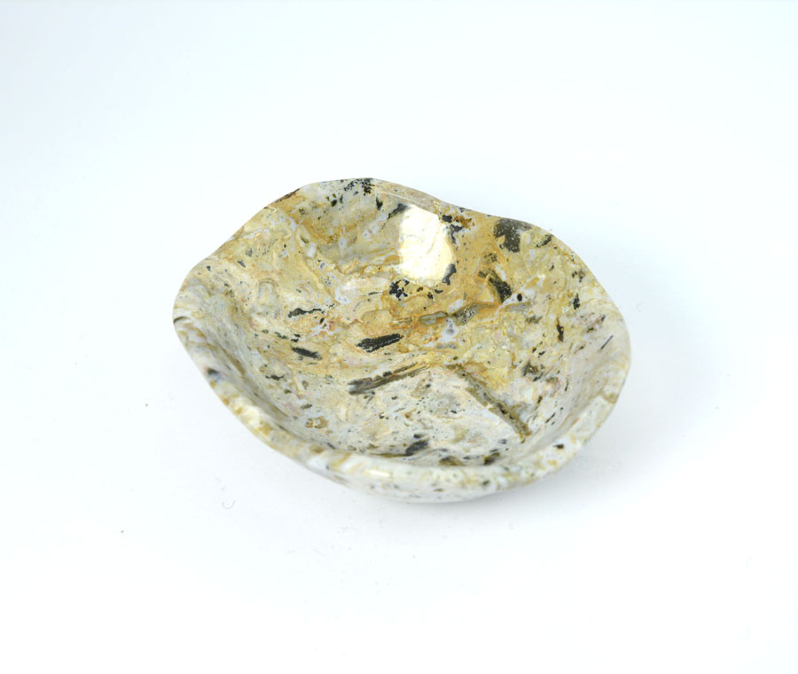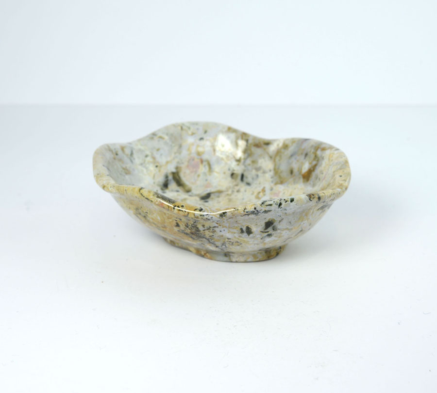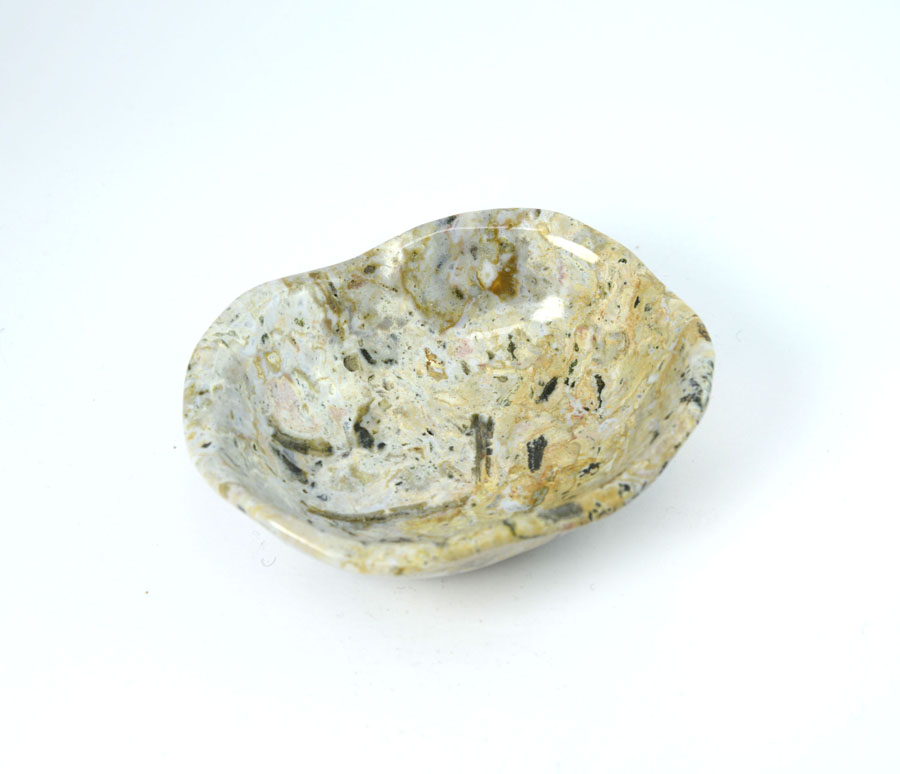 Fein gearbeitete Schale aus Ozean-Chalcedon mit lebendiger Zeichnung in zarten Beige- und Brauntönen. Diese Ozean-Chalcedon-Schale ist ein Unikat.