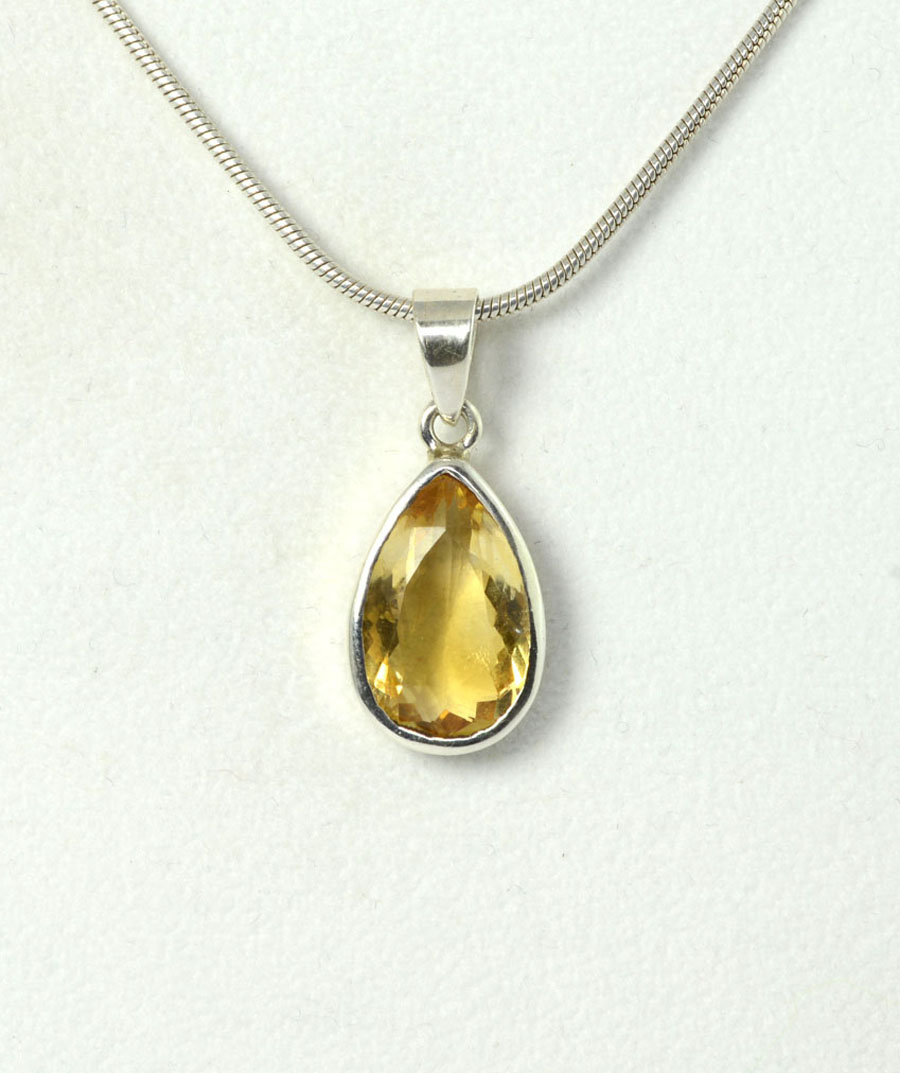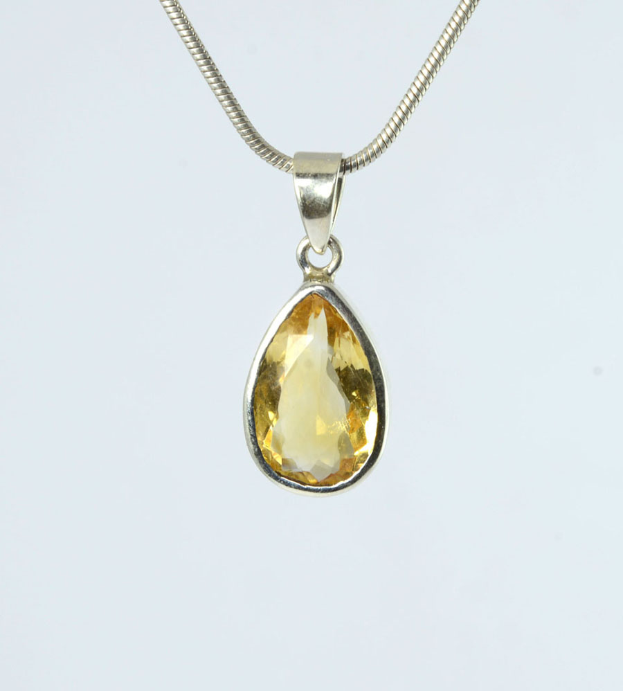 Feiner, tropfenförmiger Citrin-Anhänger mit leuchtend gelber Farbe im Facettenschliff. Der Citrin ist mit einer Zarge in Sterling Silber gefasst. Dieser Citrin-Anhänger ist ein Unikat.