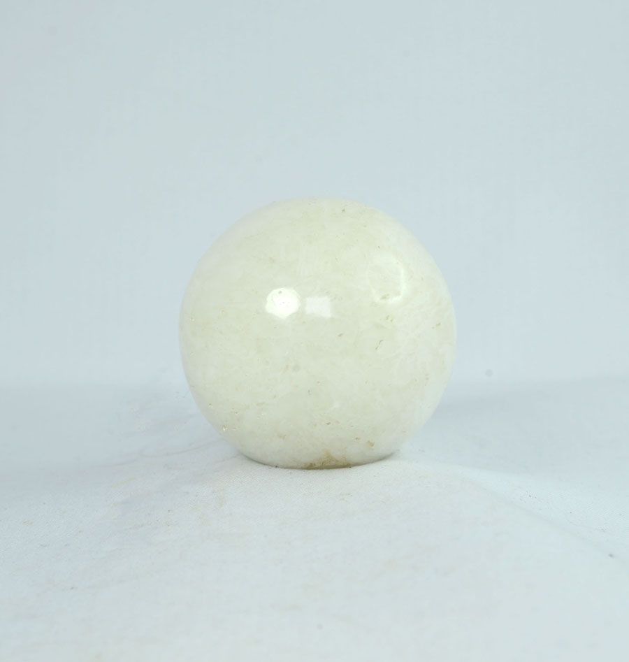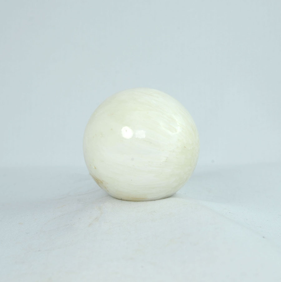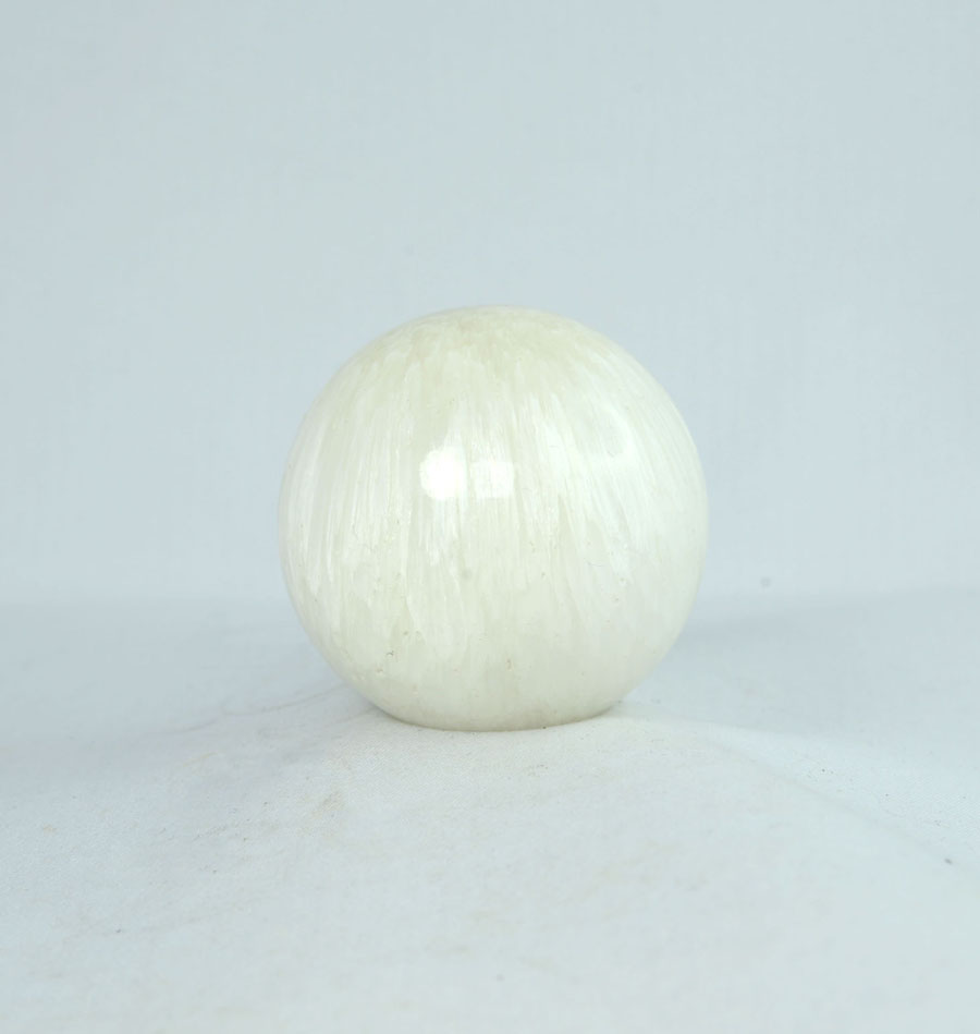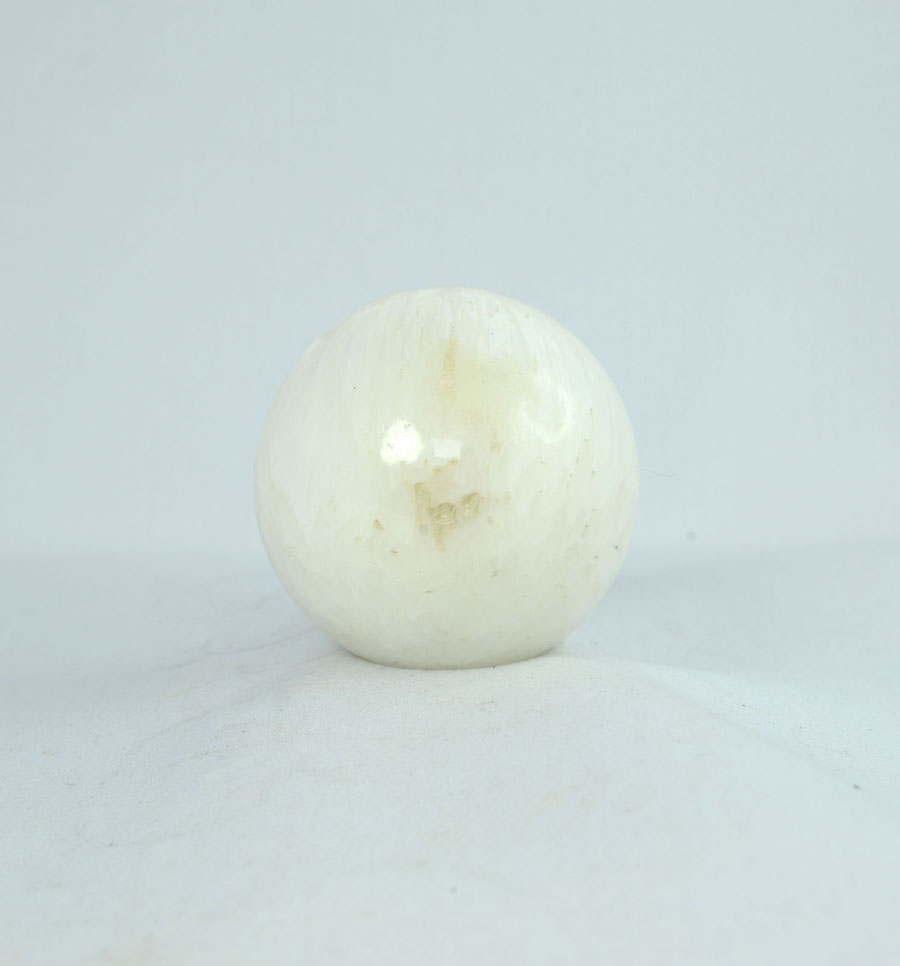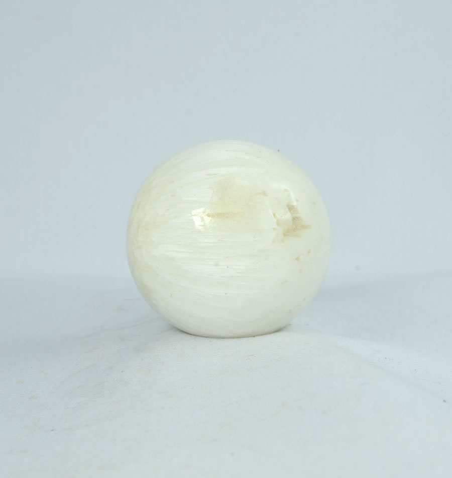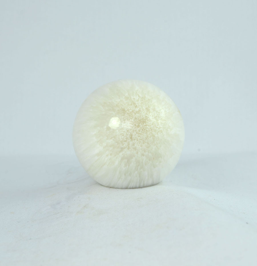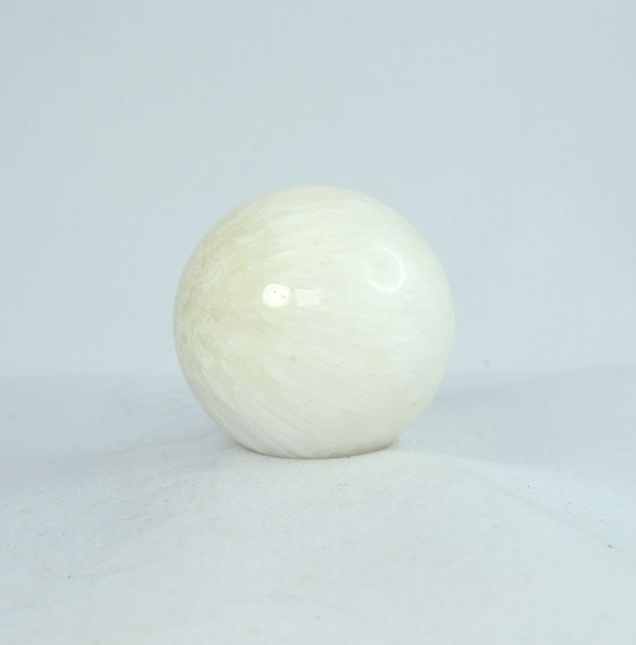 Selten: Schneeweiße Skoleszit-Kugel mit deutlich sichtbarer faseriger Struktur. Diese Skoleszit-Kugel ist ein Unikat.