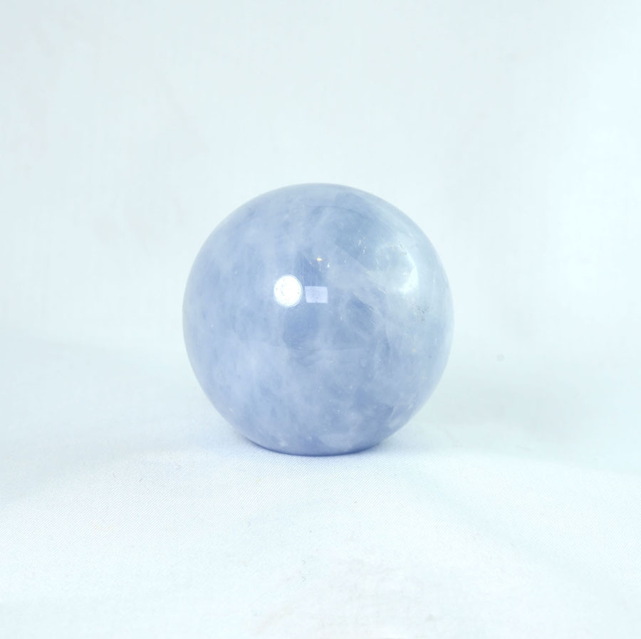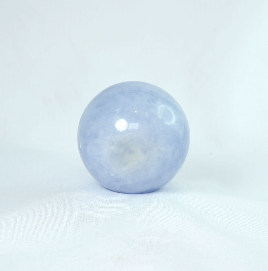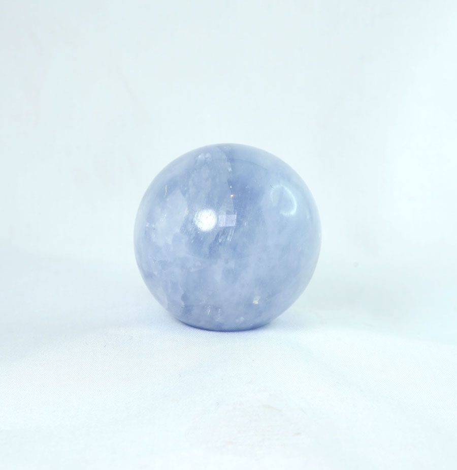 Mittelgroße, leuchtend blaue Calcit-Kugel aus Mexiko mit feiner Marmorierung. Die Calcit-Kugel eigent sich auf Grund ihrer Größe gut als Massagekugel.