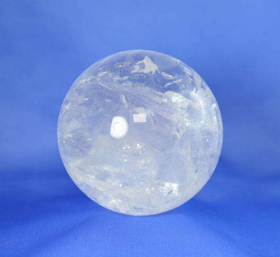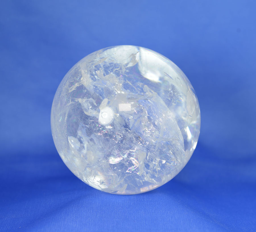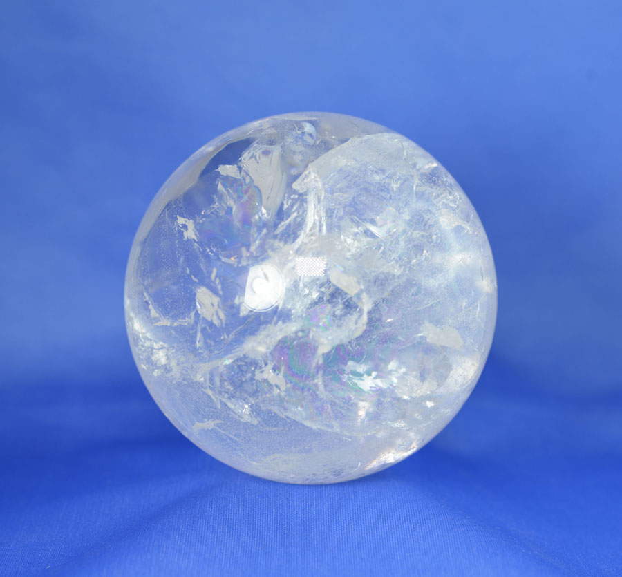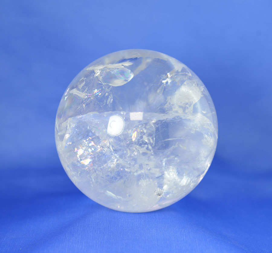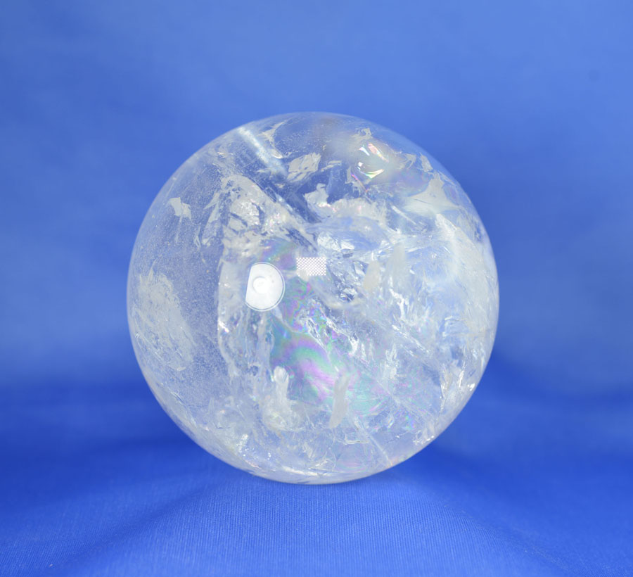 Große Kugel aus Bergkristall mit lebendigem Einschlussbild, partiell mit fein schimmernden Regenbogenflächen. Diese Bergkristall-Kugel ist ein Unikat.