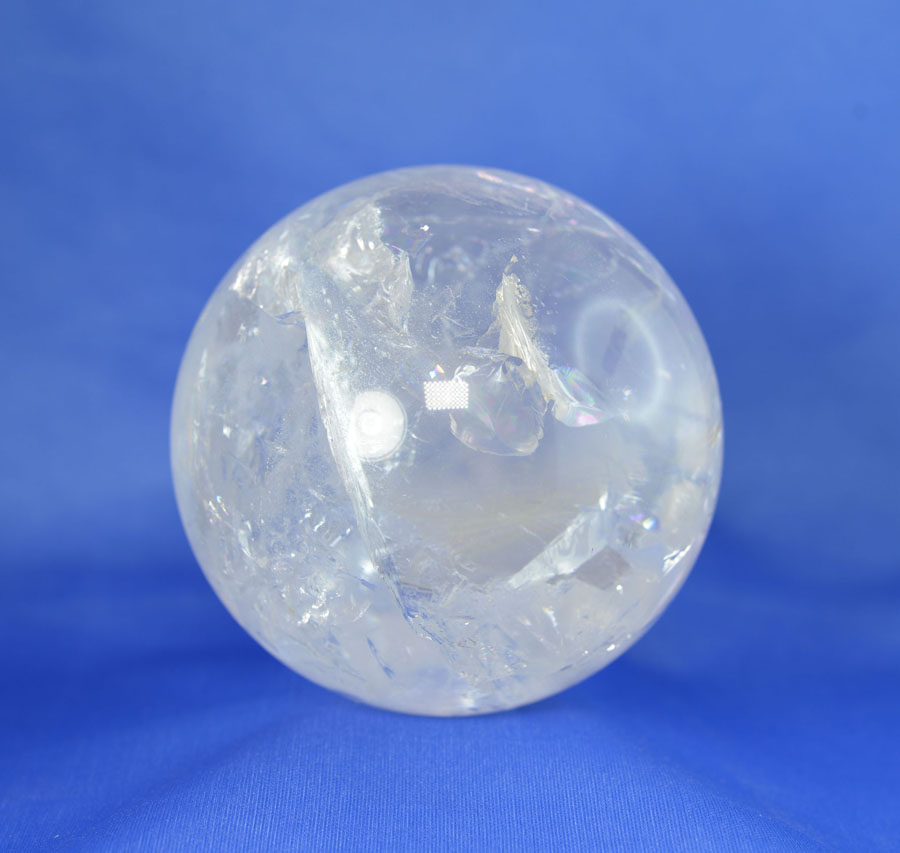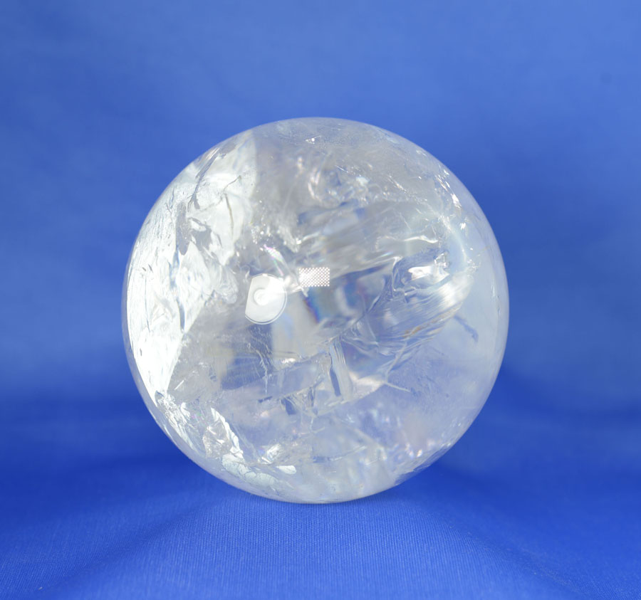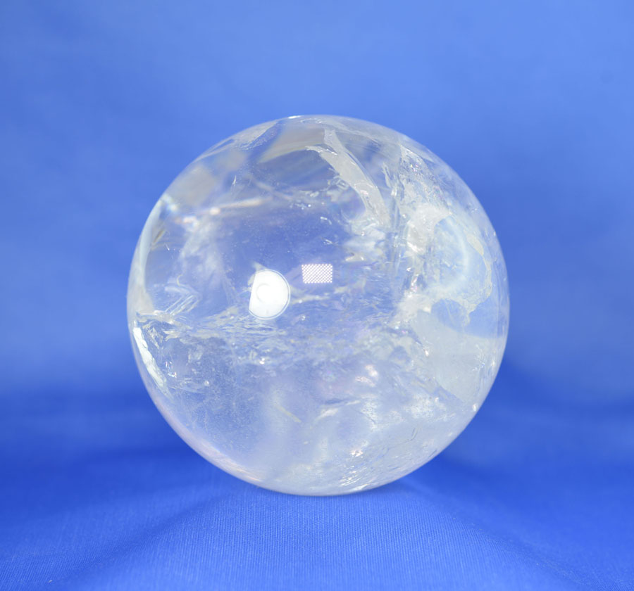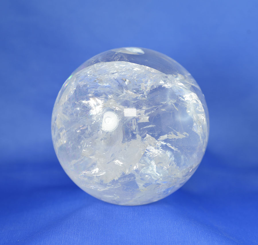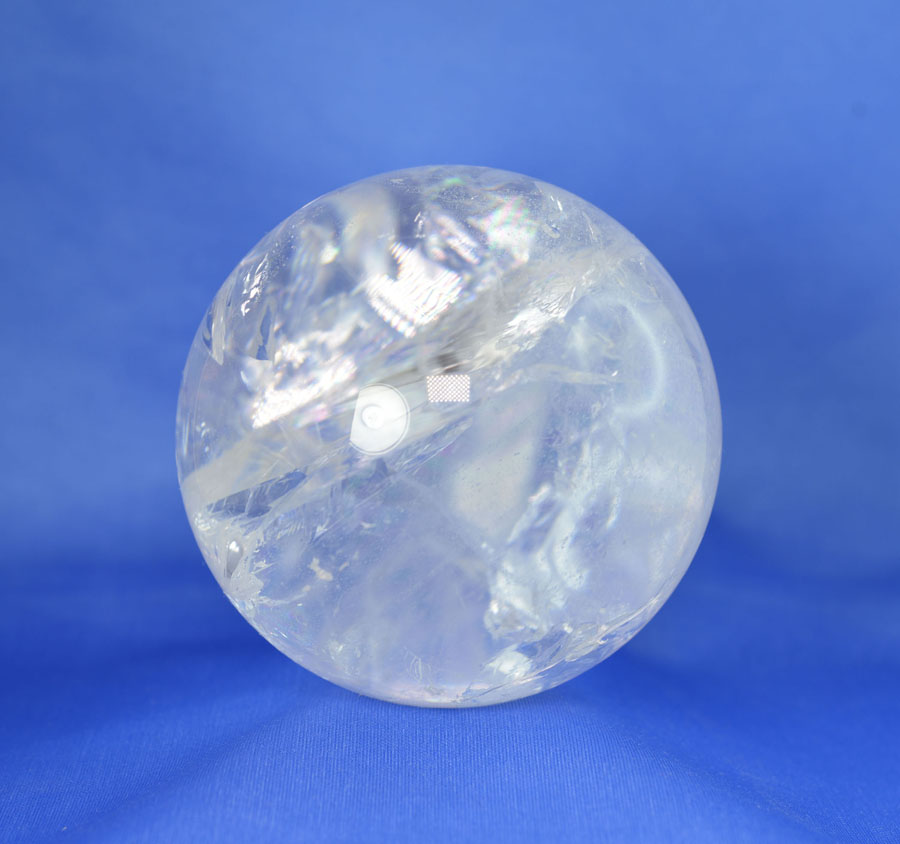 Große Kugel aus Bergkristall mit lebendigem Einschlussbild, partiell mit fein schimmernden Regenbogenflächen. Diese Bergkristall-Kugel ist ein Unikat.