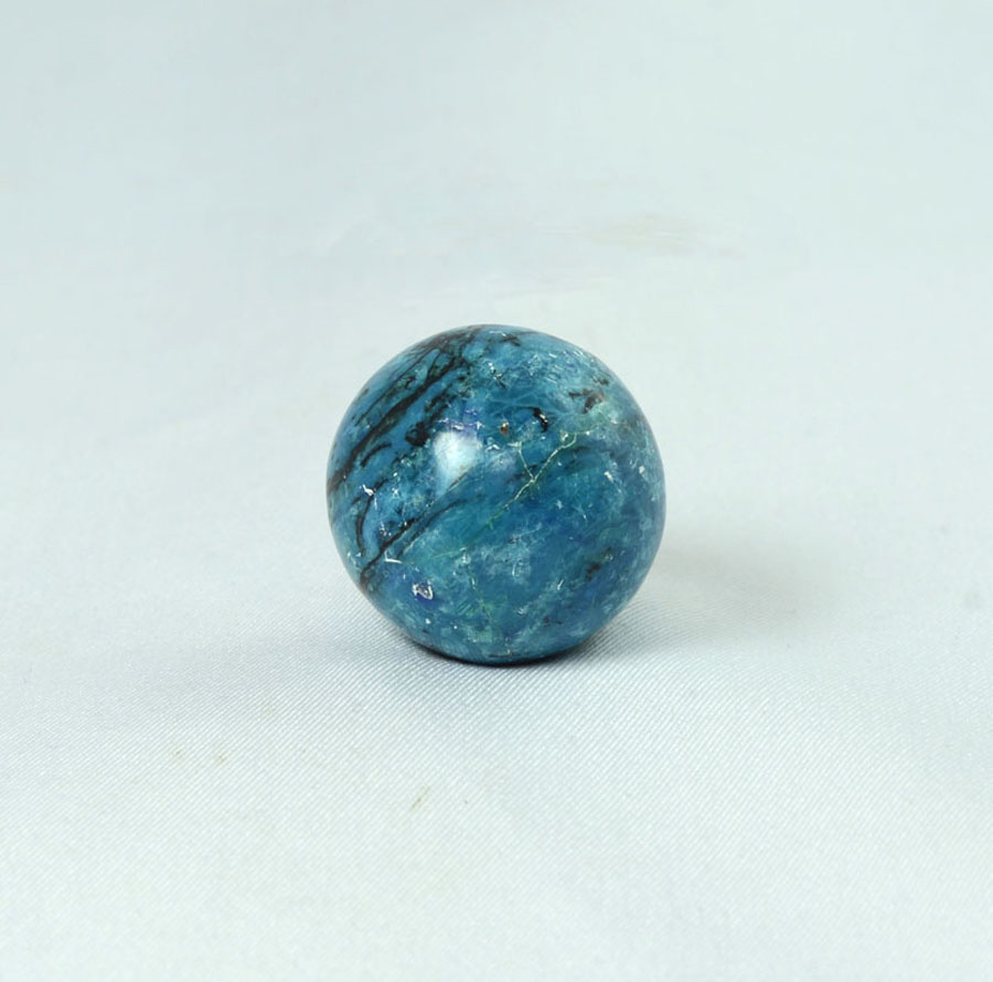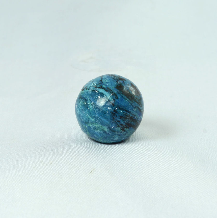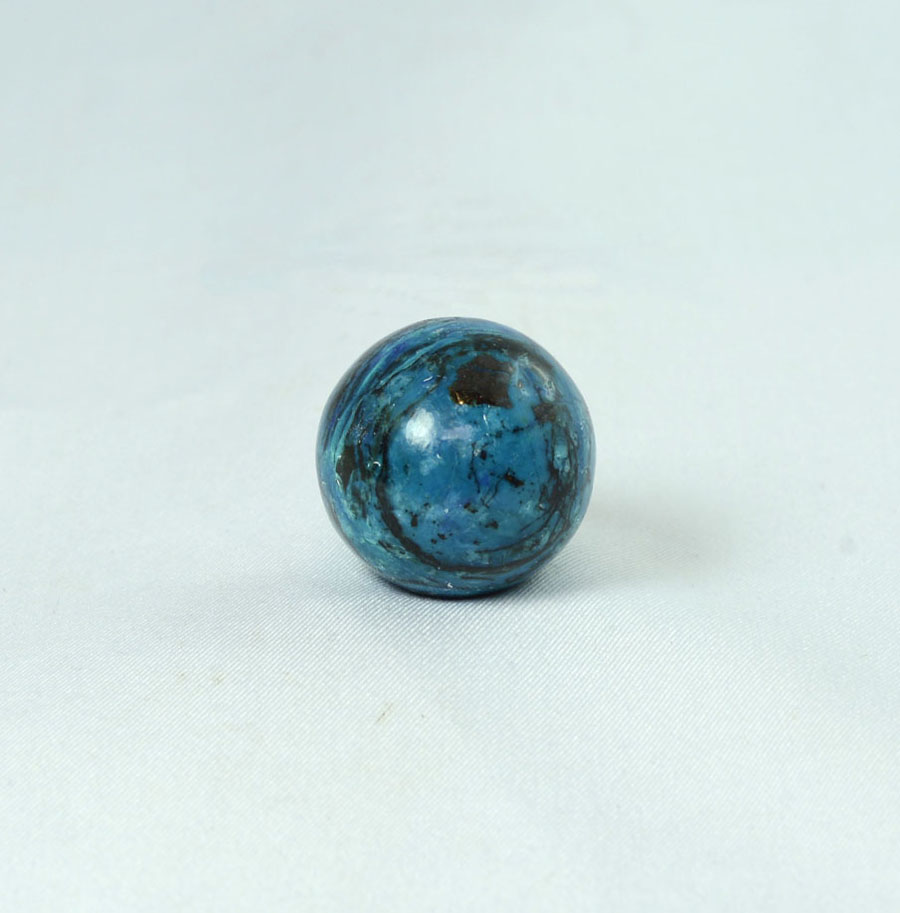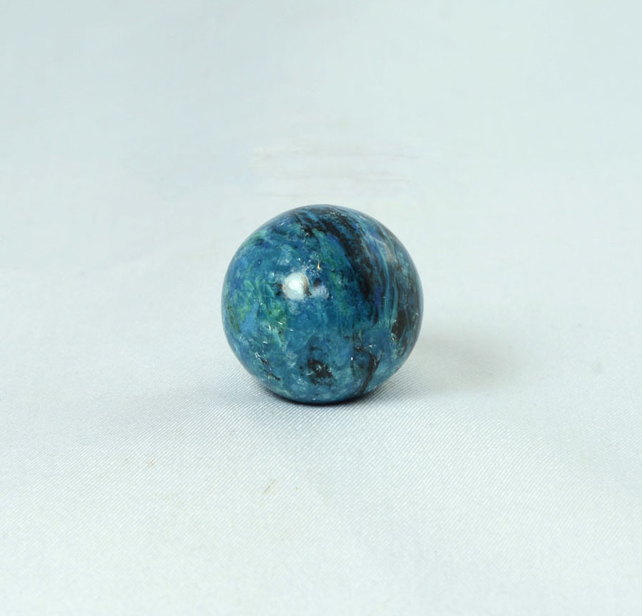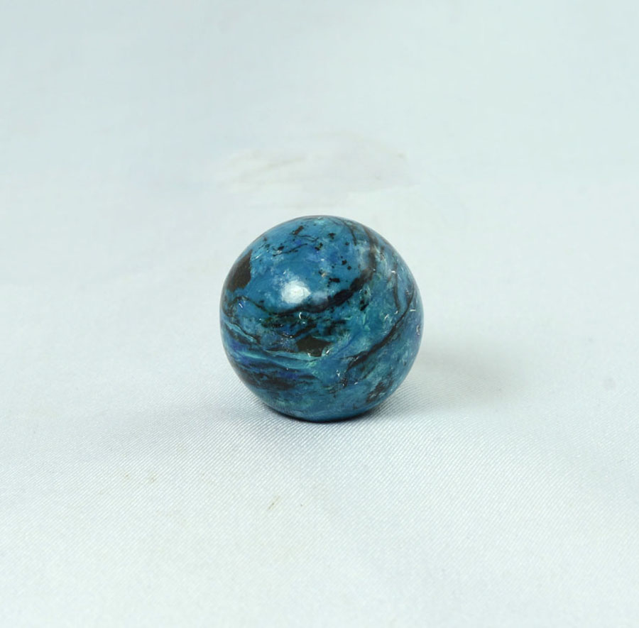 Kleine Chrysokoll-Opal-Kugel mit leuchtend türkis-blauer Farbe und lebendiger Zeichnung. Diese Chrysokoll-Opal-Kugel ist ein Unikat.