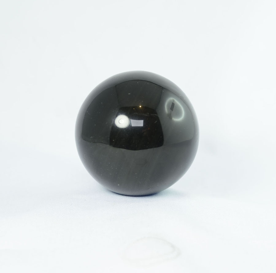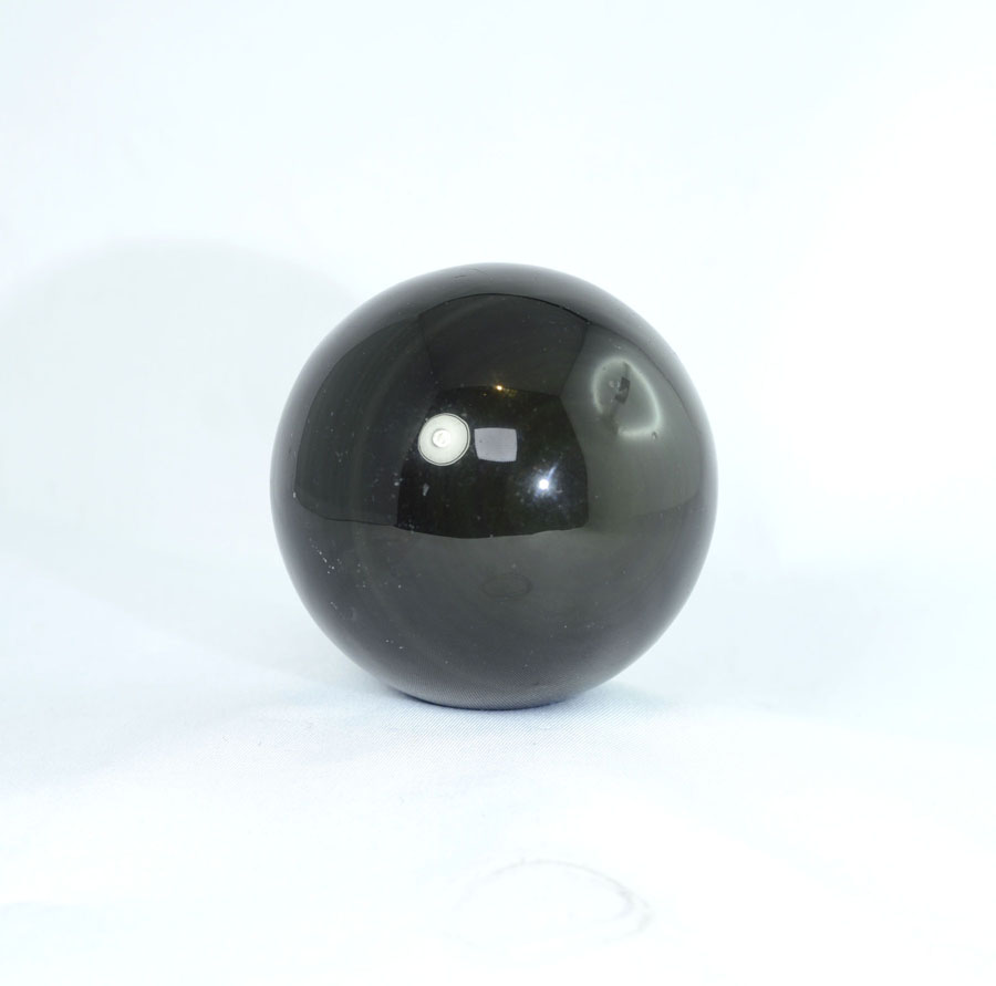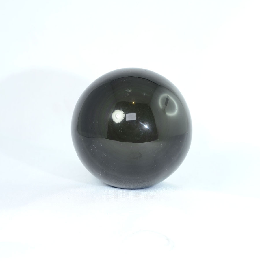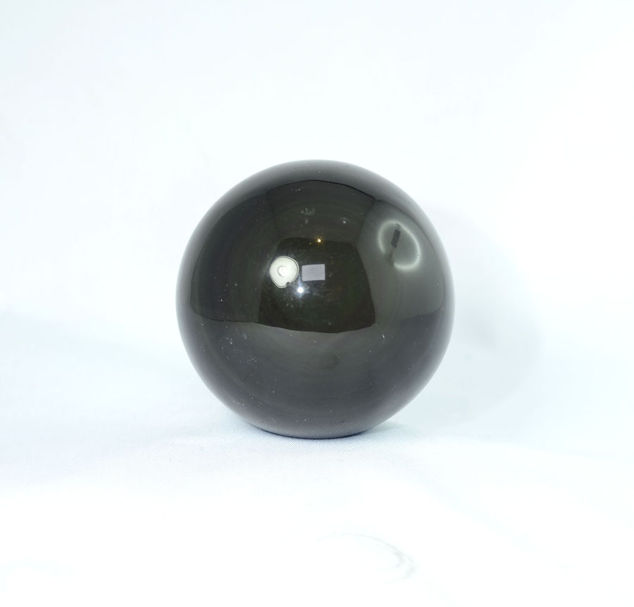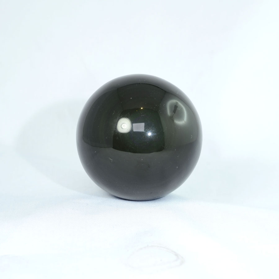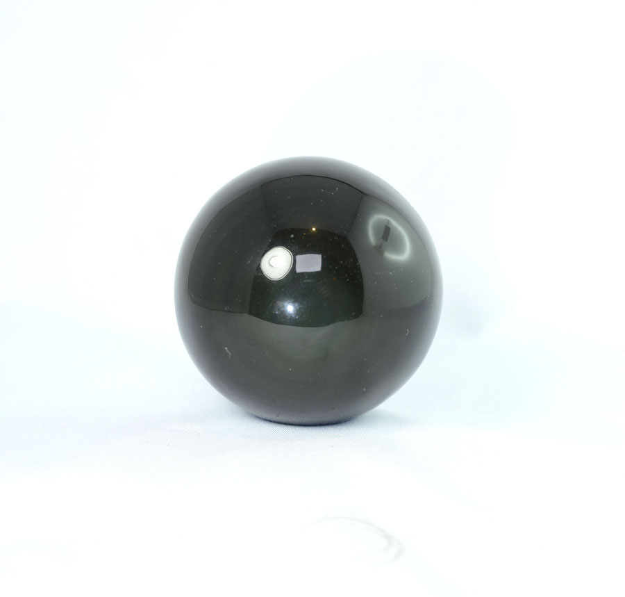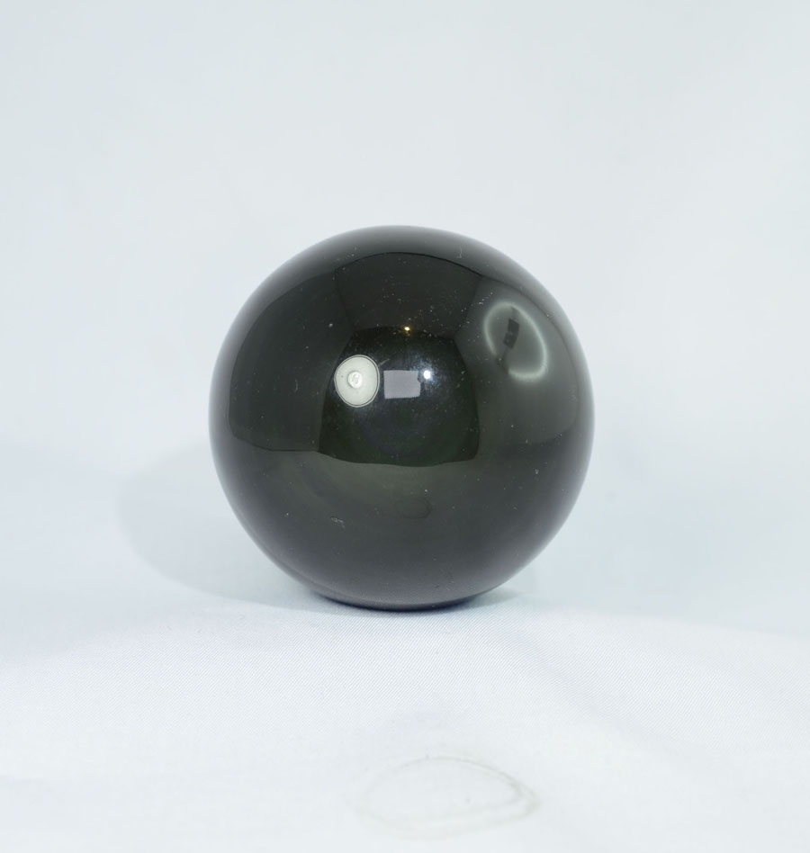 Große Kugel aus Regenbogen-Obsidian mit buntem Schimmer. Auf der einen Seite der Kugel entsteht im Licht ein magisches Auge aus grün-violetten konzentrischen Kreisen. Diese Regenbogen-Obsidian-Kugel ist ein Unikat.