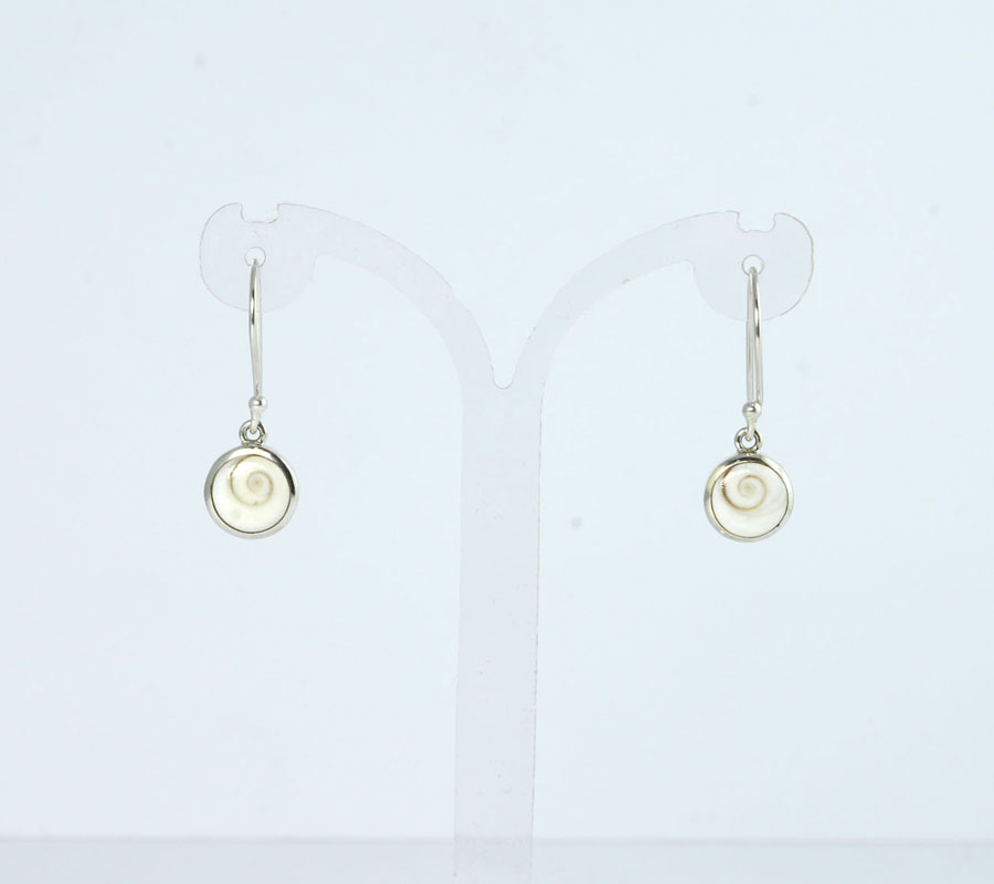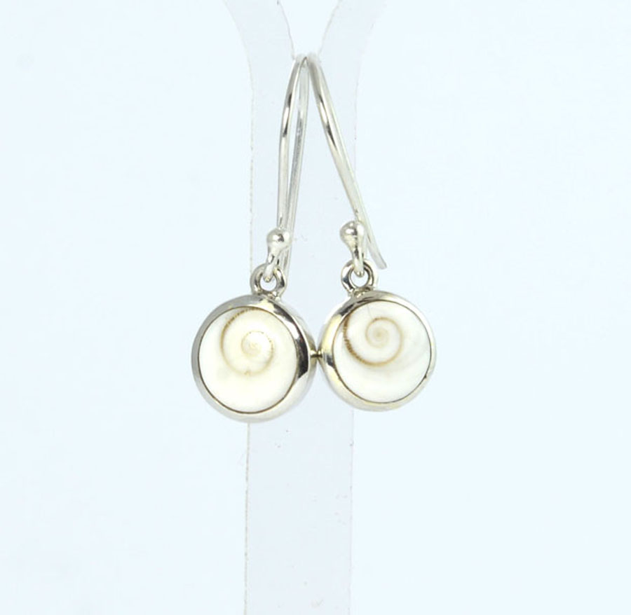 Zierliche Ohrhänger mit Shiva-Auge-Muscheln. Die runden Cabochons haben eine feine, spiralförmige Zeichnung und sind in Sterling Silber gefasst. Dieses Paar Ohränger ist ein Unikat.