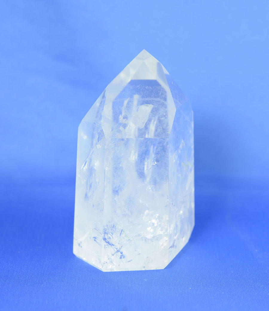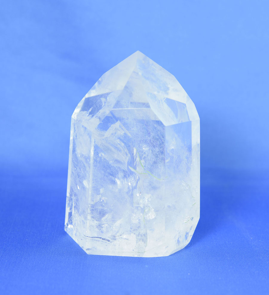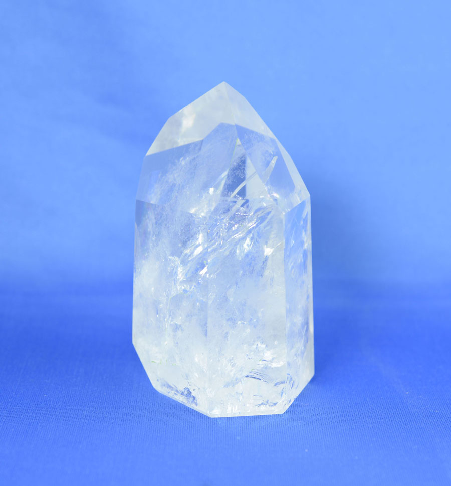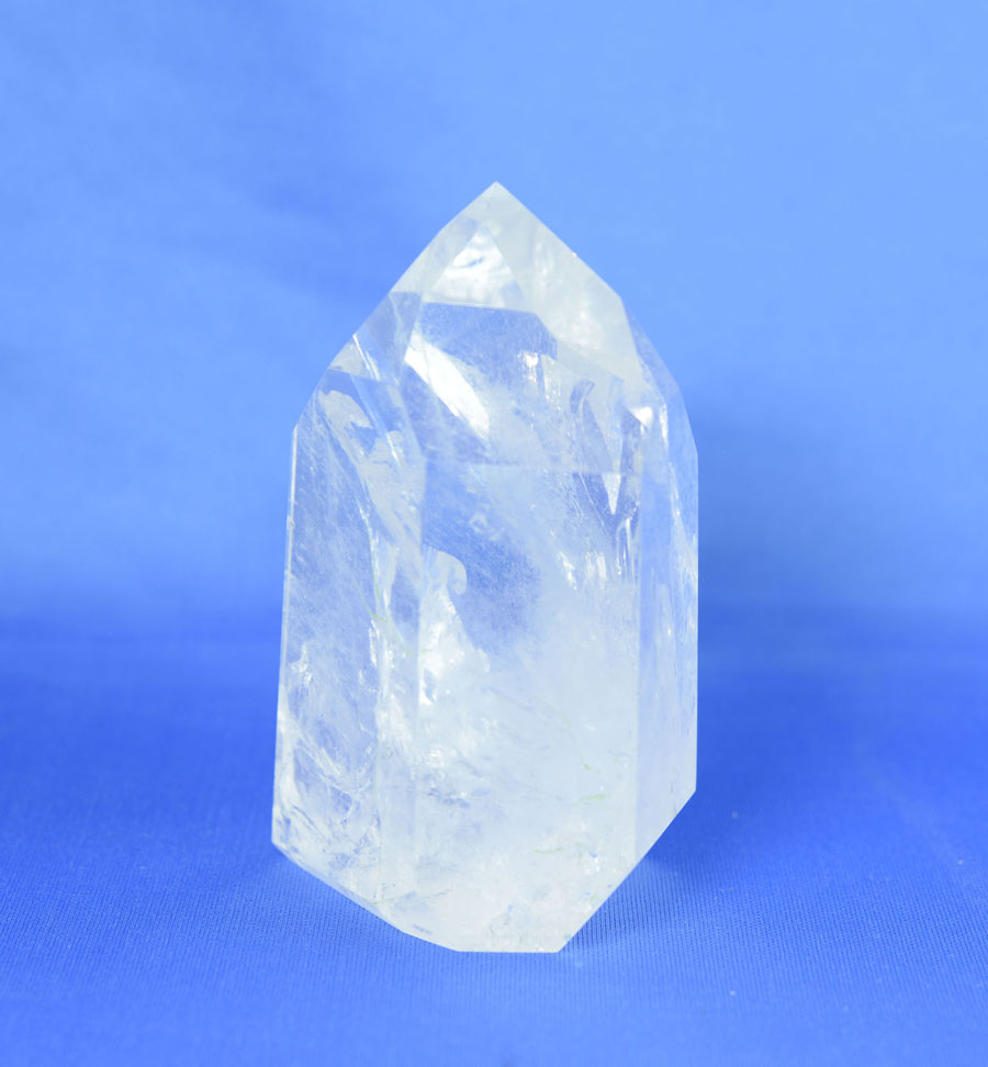 Mittelgroße und vollständig polierte Bergkristall-Einzelspitze. Die Spitze hat ein sehr lebendiges Einschlussbild mit leicht irisierenden Flächen. Dieses Unikat ist ein schönes Dekostück und eignet sich ebenfalls sehr gut zur Meditation.