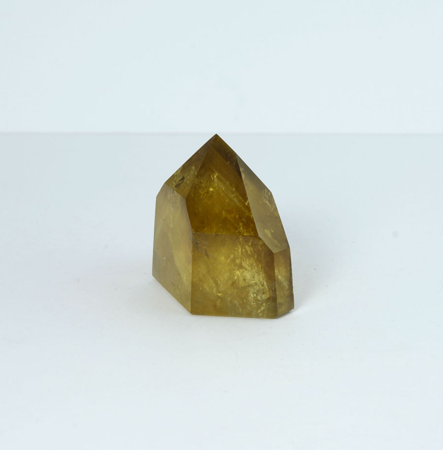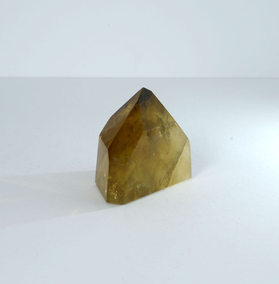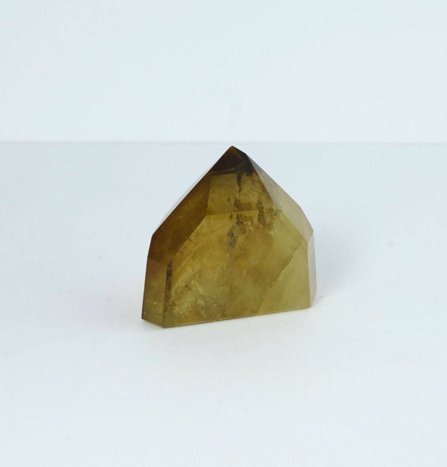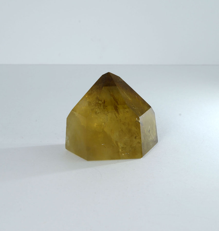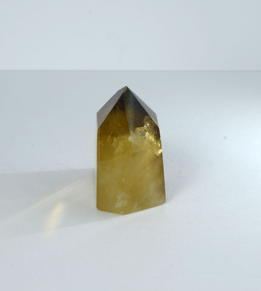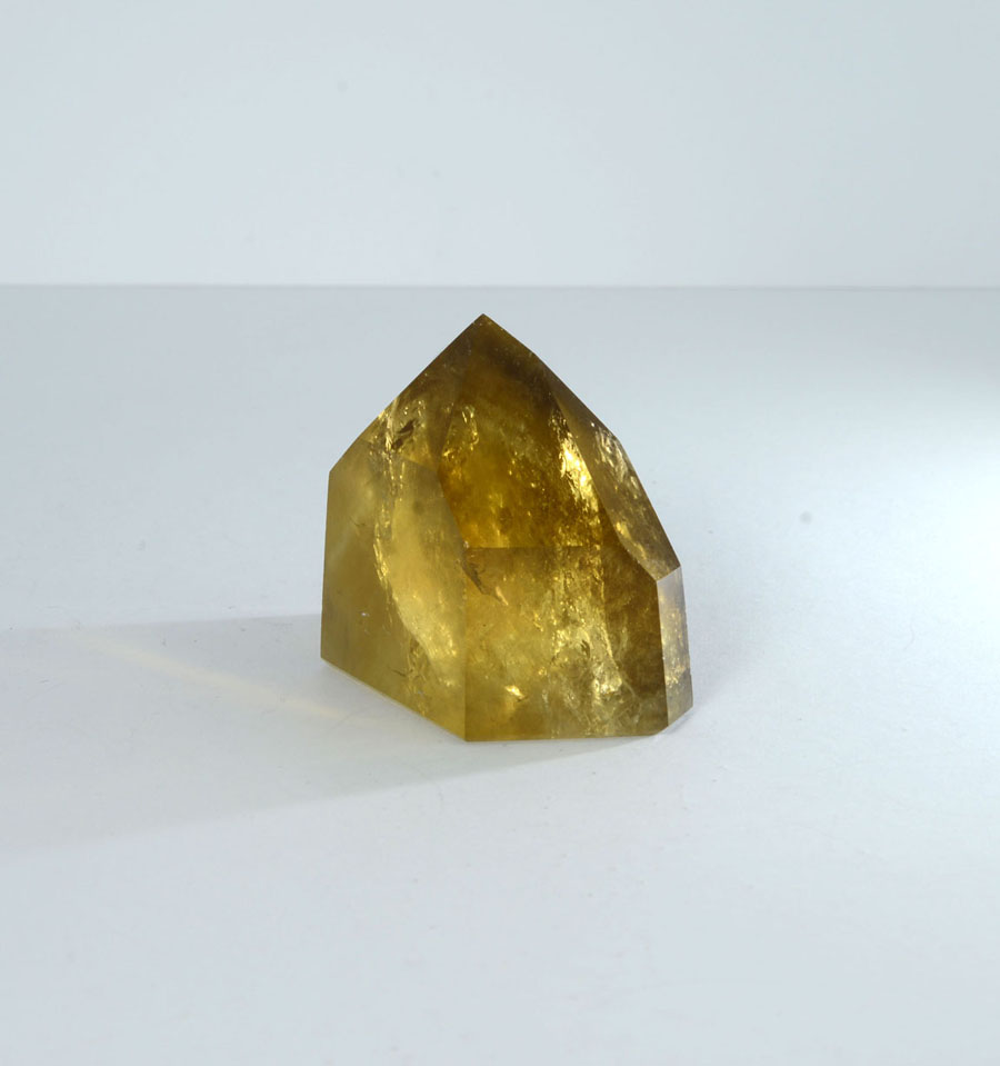 Intensiv gelb bis goldbrauner und vollständig polierter Natur-Citrin. Der Kristall hat ein lebendiges Einschlussbild. Diese Citrin-Spitze ist ein Unikat.