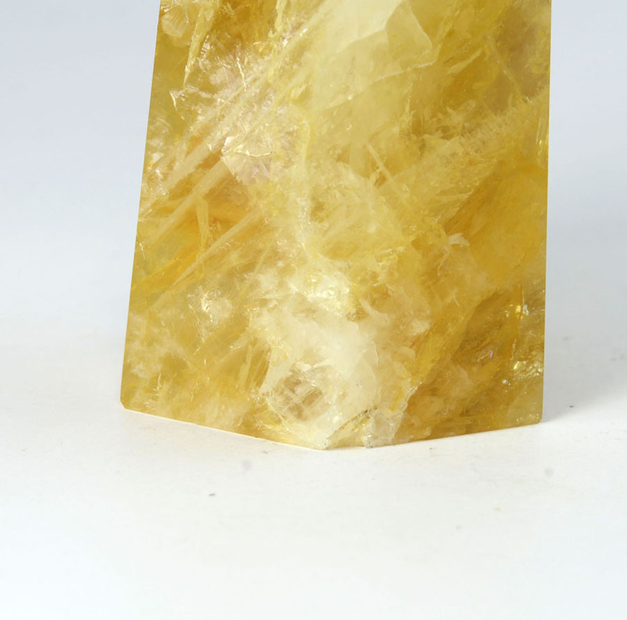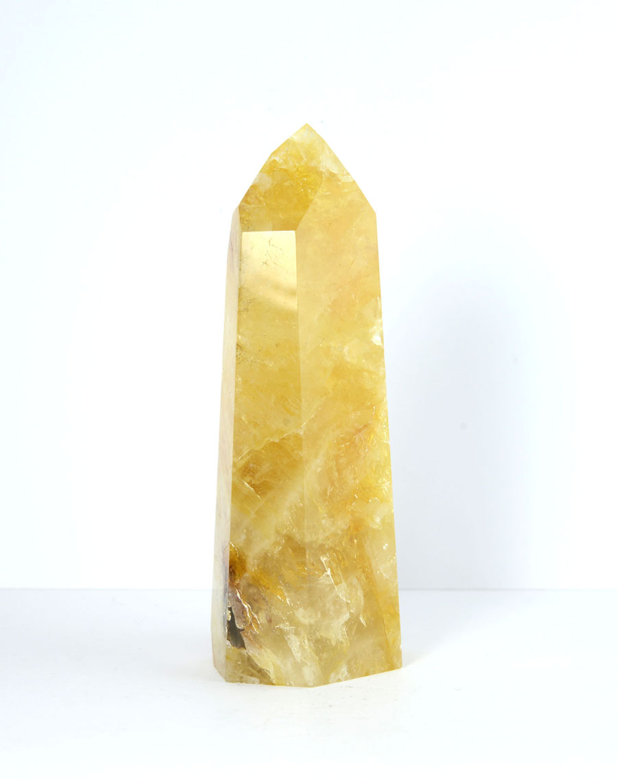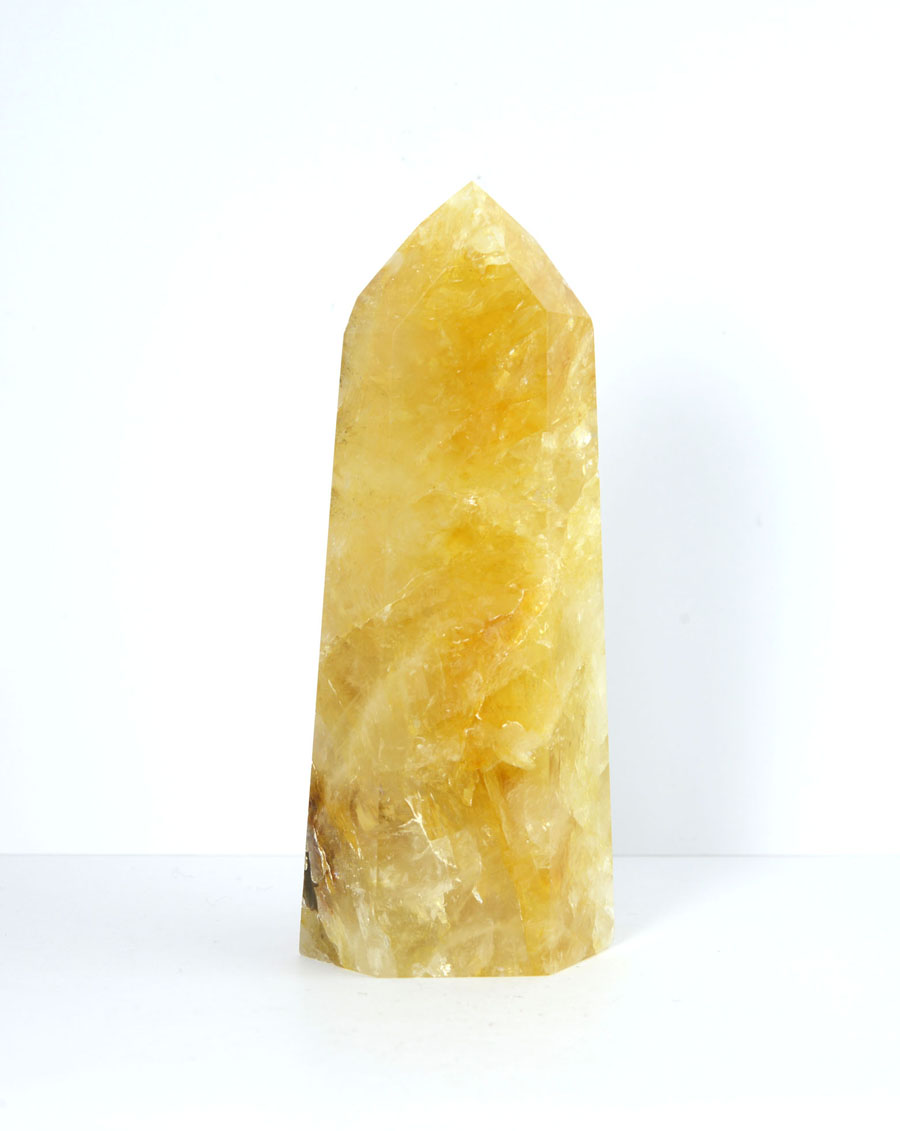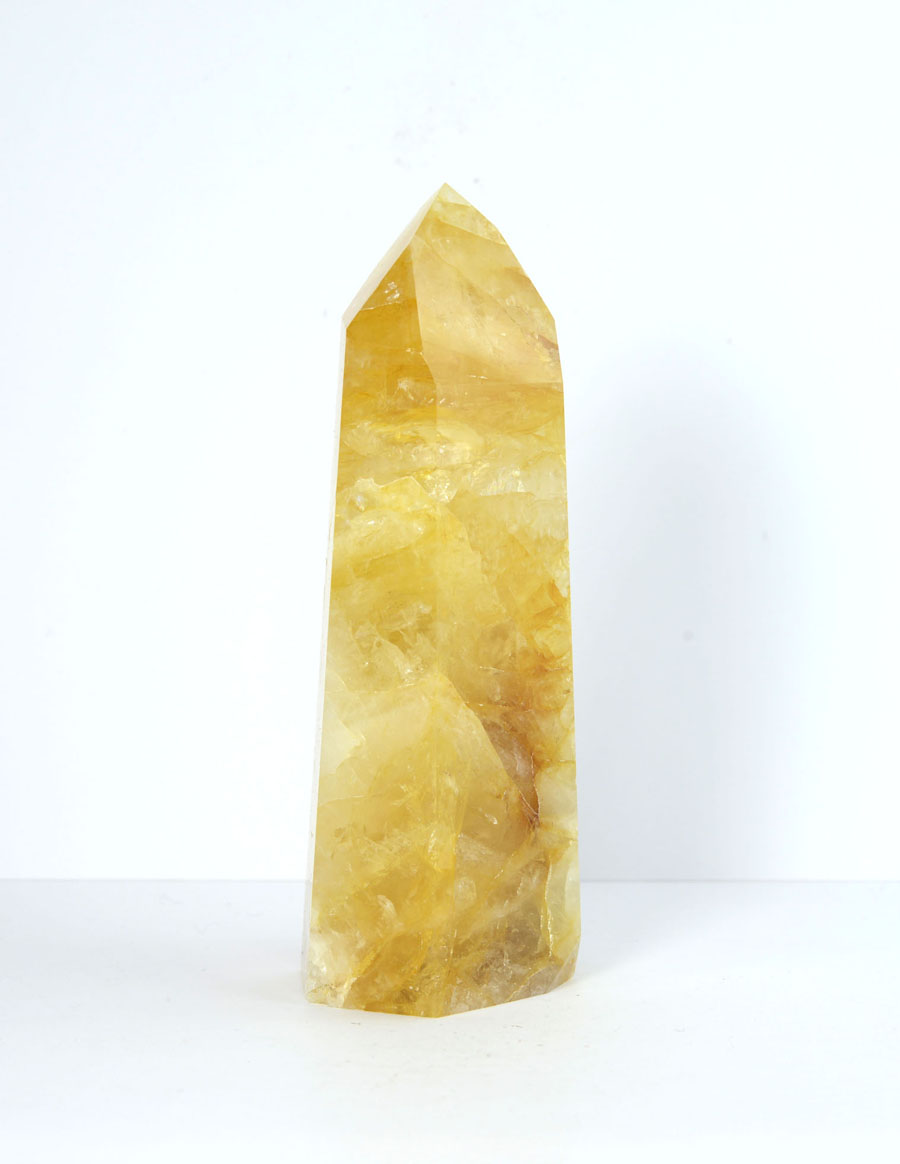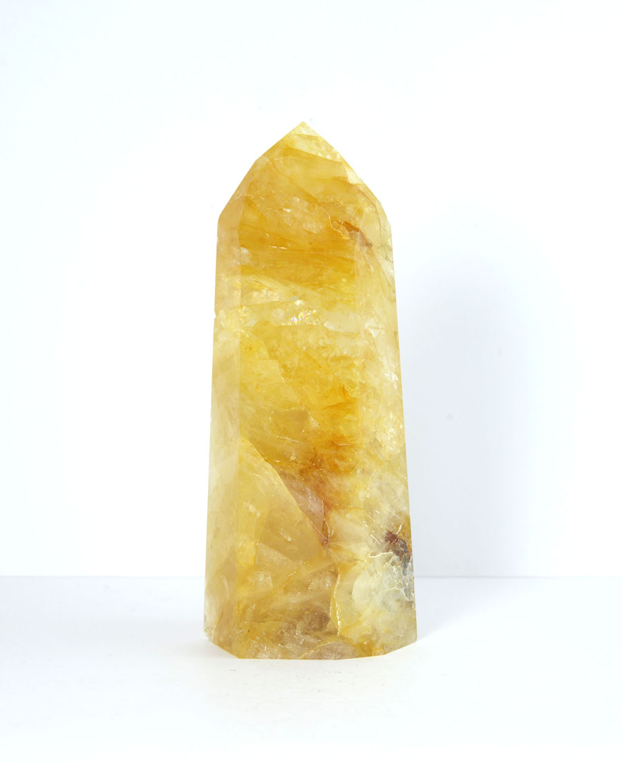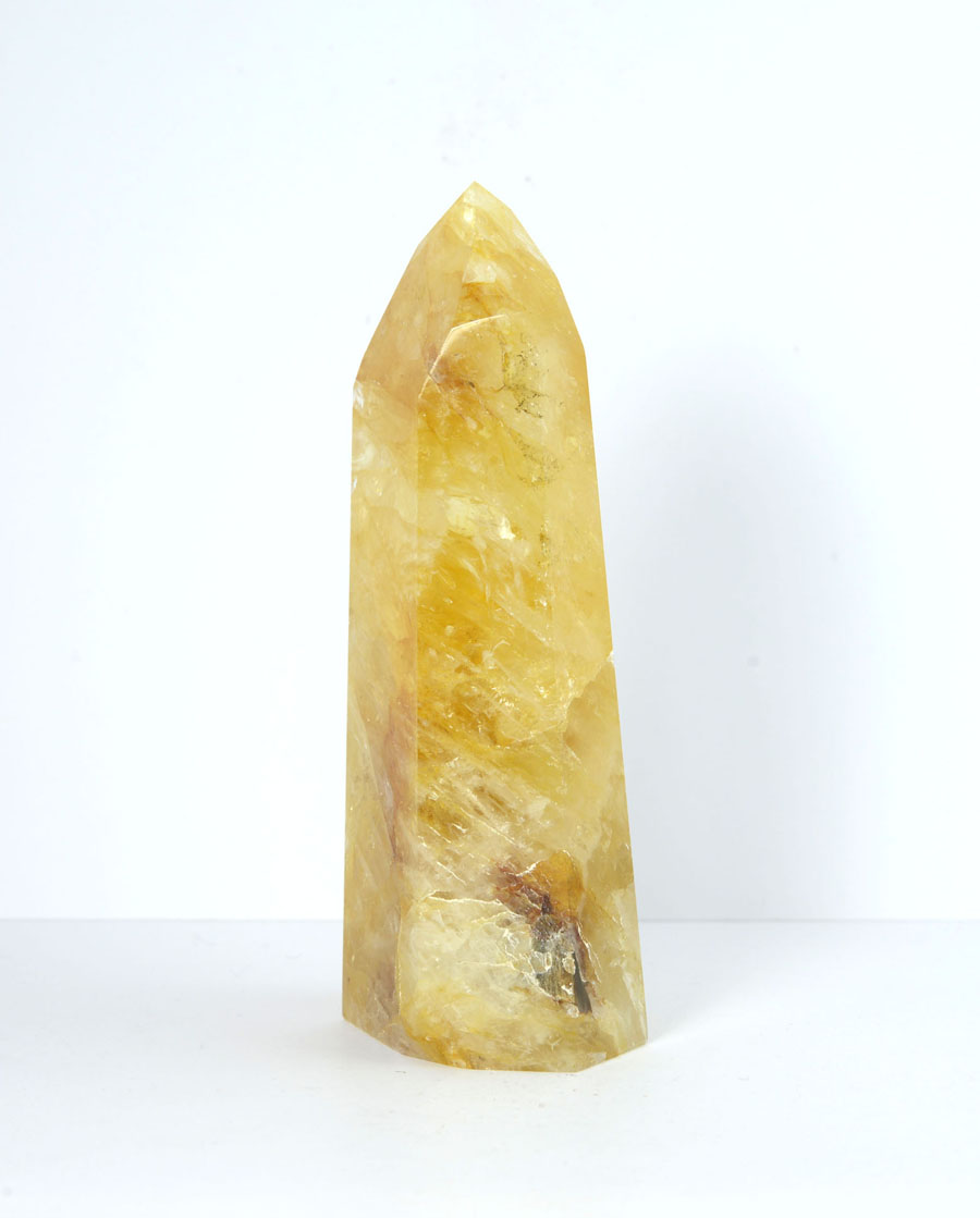 Große Limonit-Quarz-Spitze in kräftigen, goldgelben Tönen mit lebendigem Einschlussbild. Diese Limonit-Quarz-Spitze ist ein Unikat.