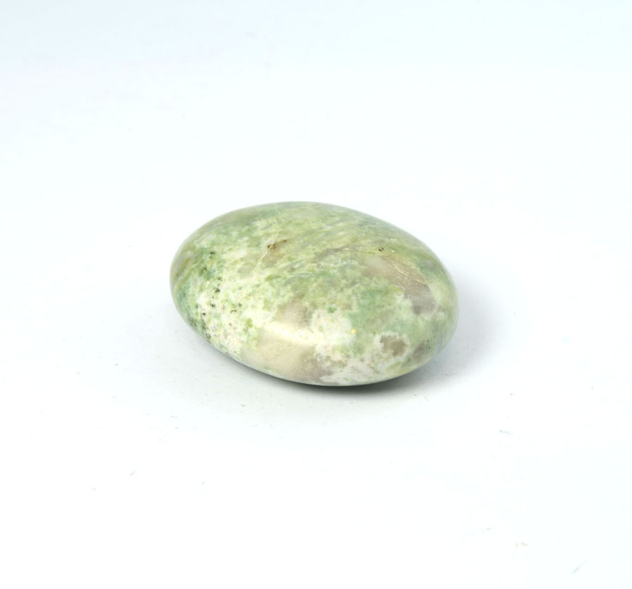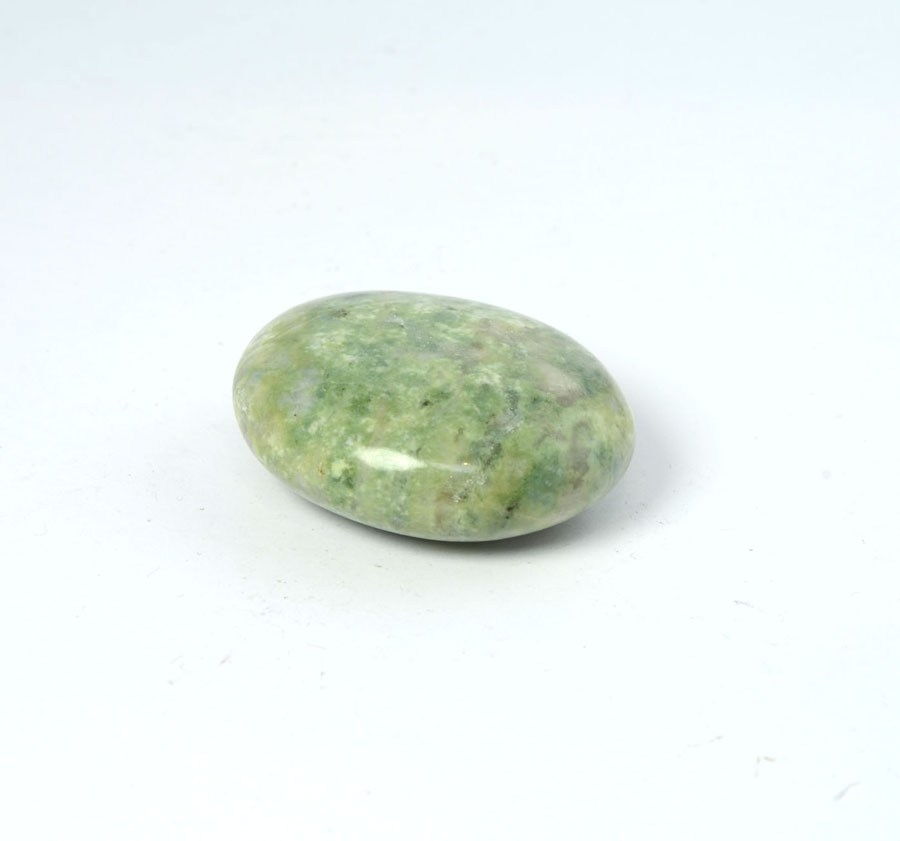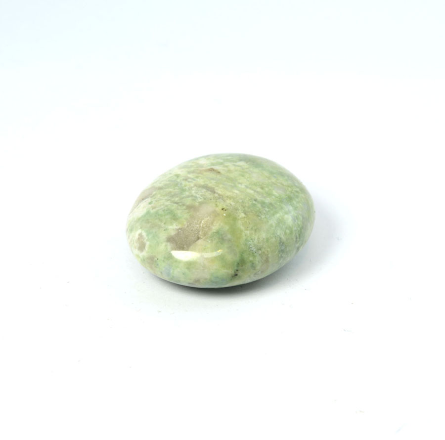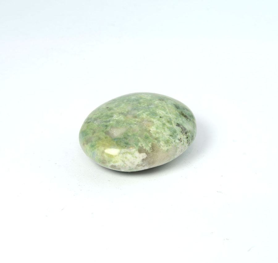 Flacher Handschmeichler aus leuchtend grünem Hackmanit mit feiner Zeichnung. Dieser Hackmanit-Handschmeichler ist ein Unikat.