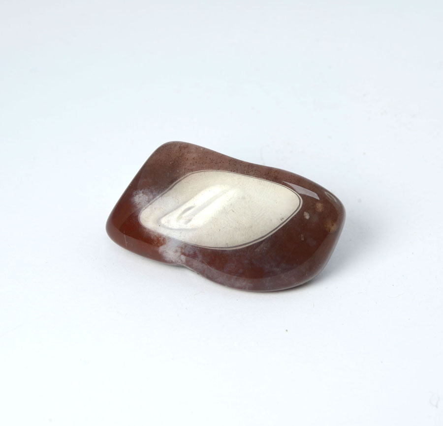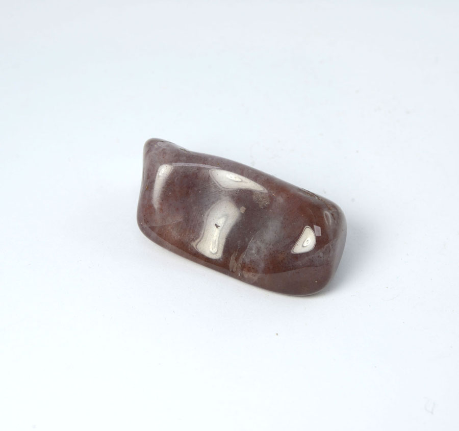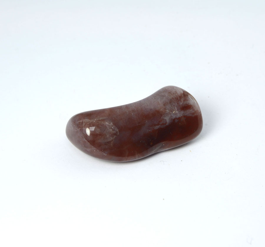 Roter Chalcedon-Handschmeichler, durchscheinend und mit rötlich-brauner Farbe. Dieser rote Chalcedon-Handschmeichler ist ein Unikat.