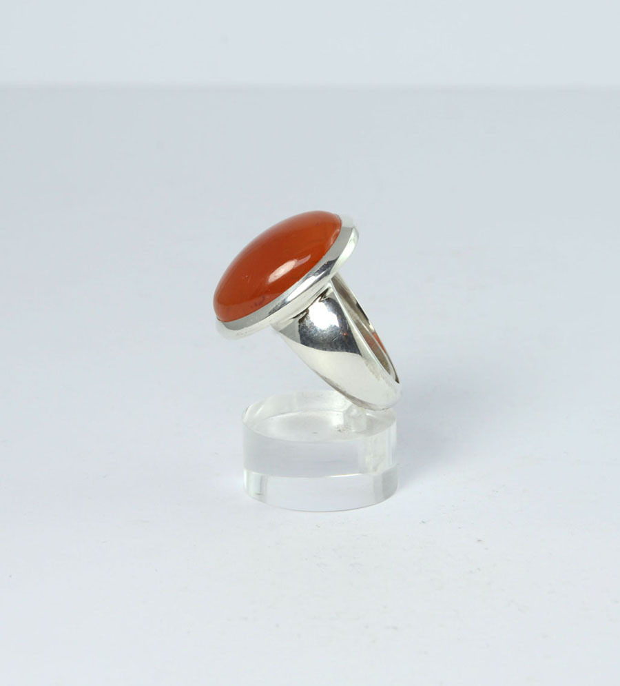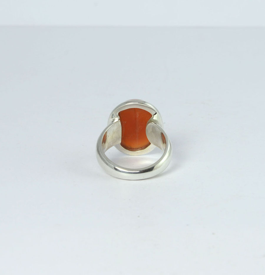 Leuchtend oranger Karneol-Ring. Der durchscheinende, ovale Cabochon ist in Sterling Silber eingefasst. Dieser Karneol-Ring ist ein Unikat.