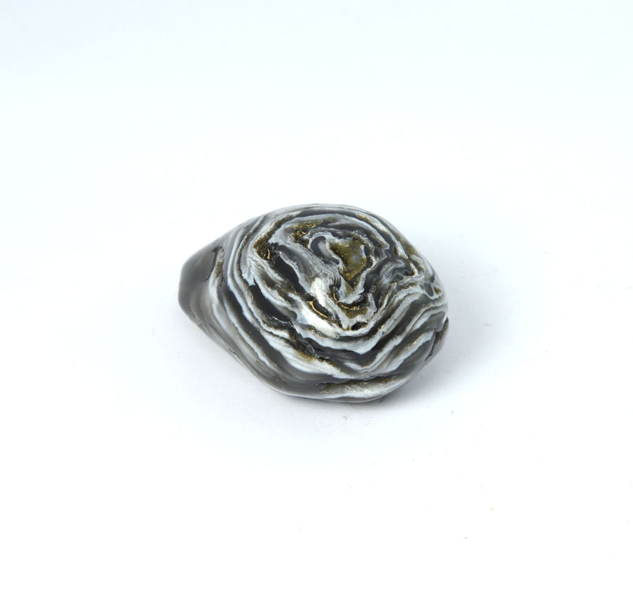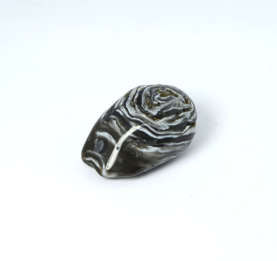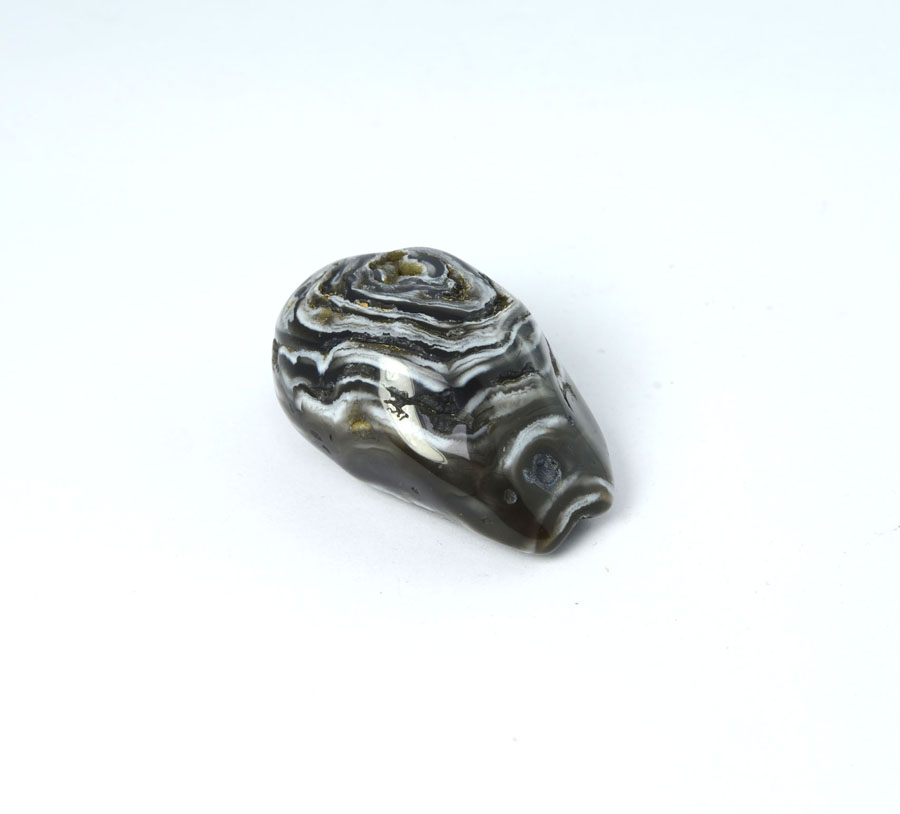 Seltener, mittelgroßer Wasserachat-Handschmeichler in dunklen Farbtönen und mit lebendiger Zeichnung. Wenn man diesen Wasserachat nah ans Ohr hält und kräftig schüttelt, kann man das leichte Glucksen des eingeschlossenen Wassers hören. Dieser Wasserachat-Handschmeichler ist ein Unikat.