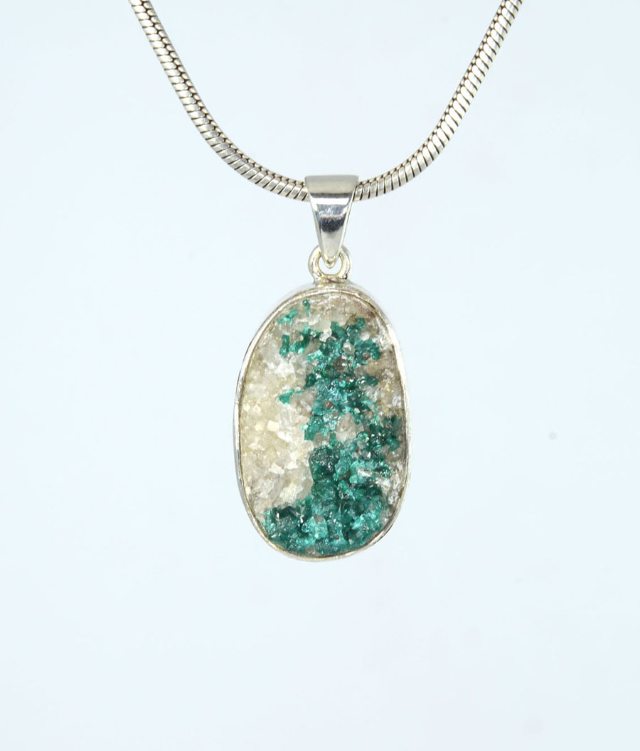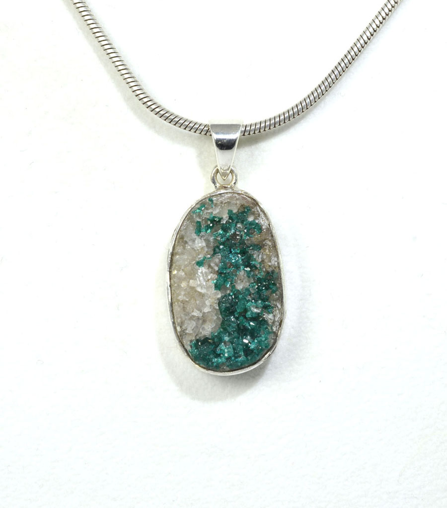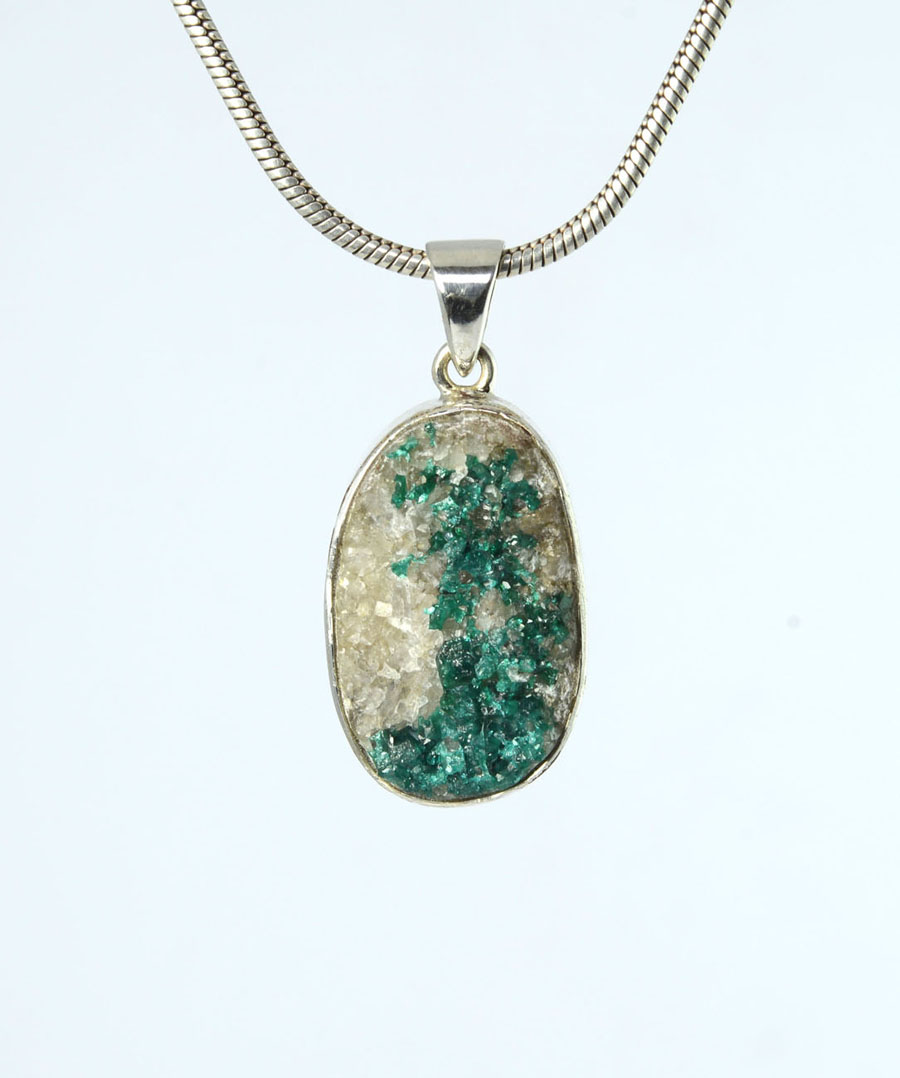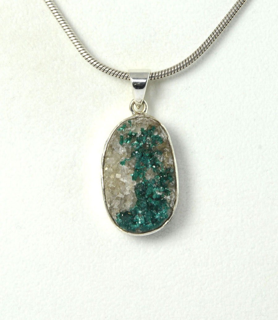 Rarität: Kettenanhänger mit leuchtend grünem Dioptas auf hellem Muttergestein. Der ovale Stein ist in Sterling Silber gefasst. Dieser Dioptas-Anhänger ist ein Unikat.