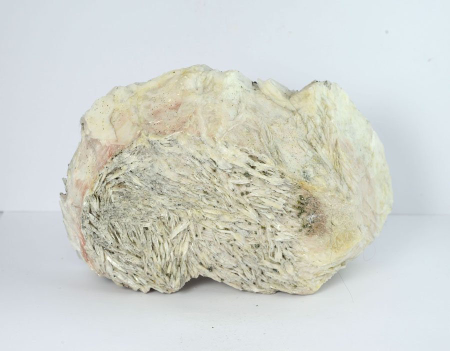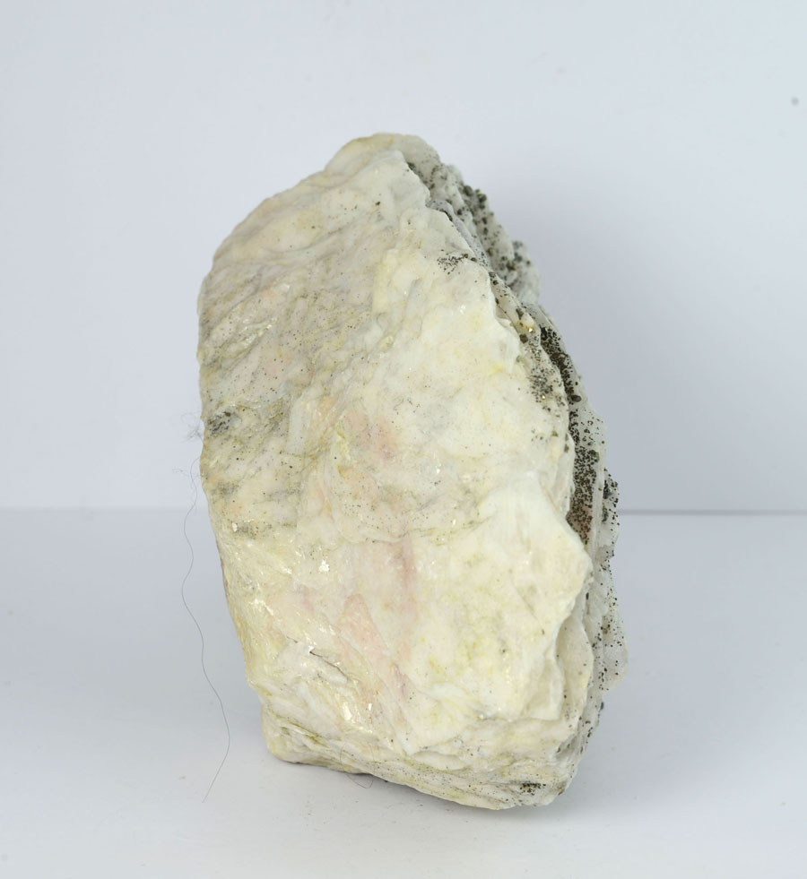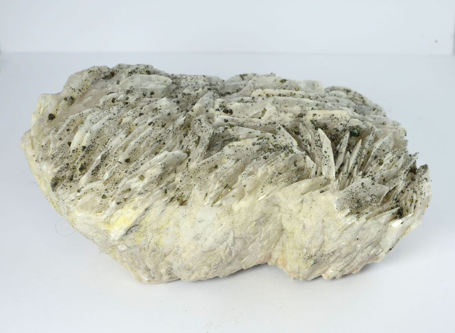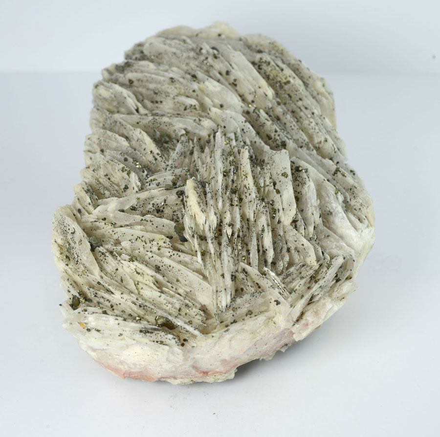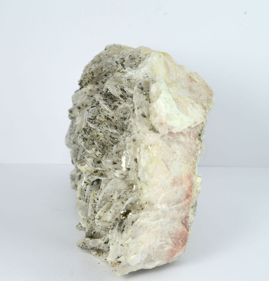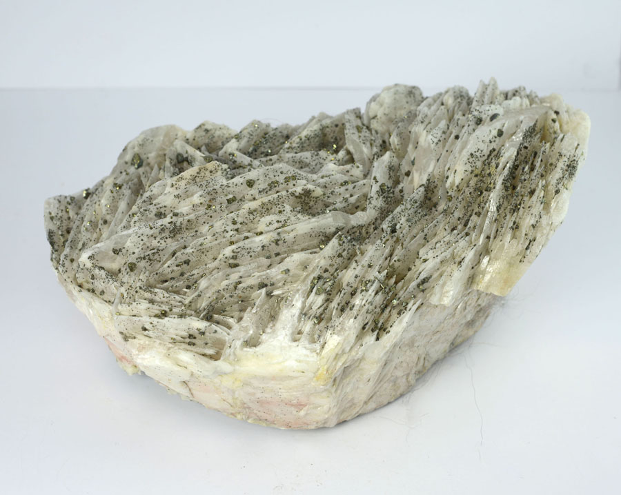 Großer, weißer Baryt-Rohstein mit feinen, goldglänzenden Markasitkristallen. Dieser Baryt-Rohstein ist ein Unikat.