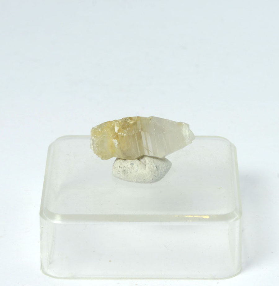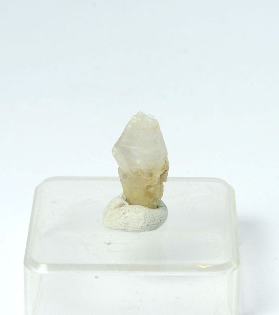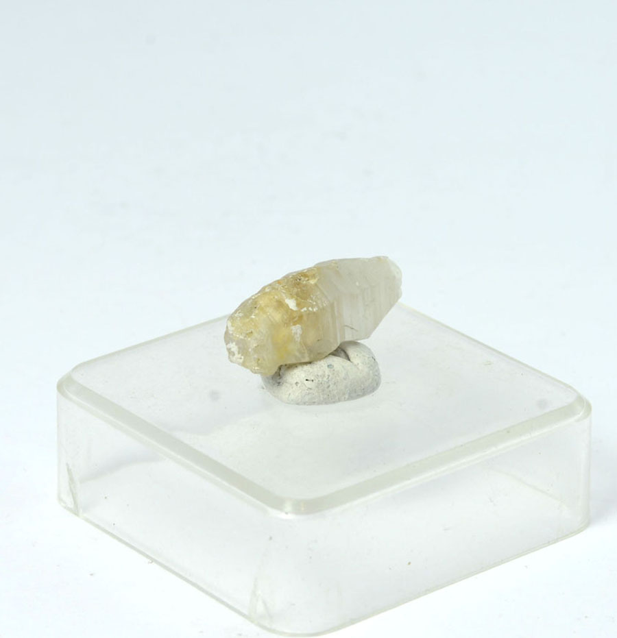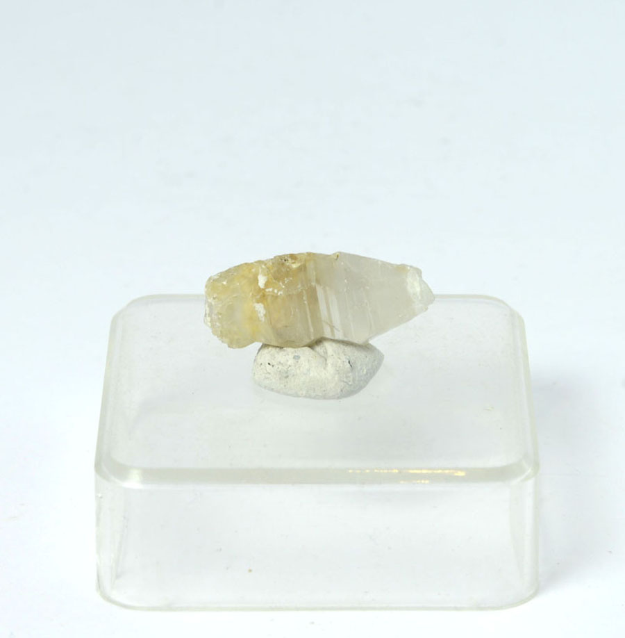 Schön ausgebildeter, transparenter Saphir-Kristall. Der Kristall ist farblich zoniert: überwiegend weiß und teilweise leicht gelblich. Dieser Saphir-Krisdtall ist ein Unikat.