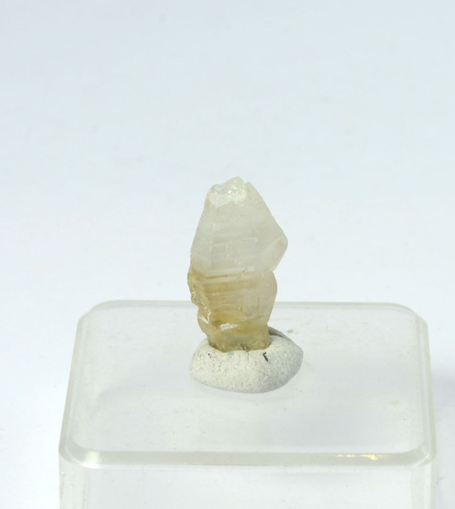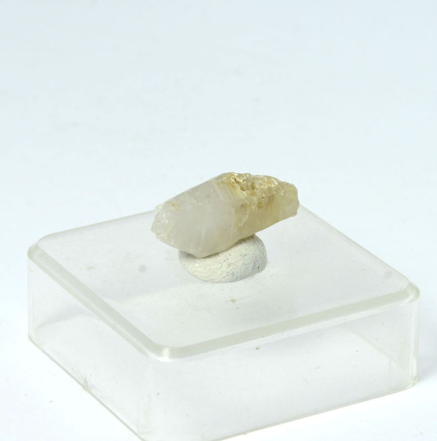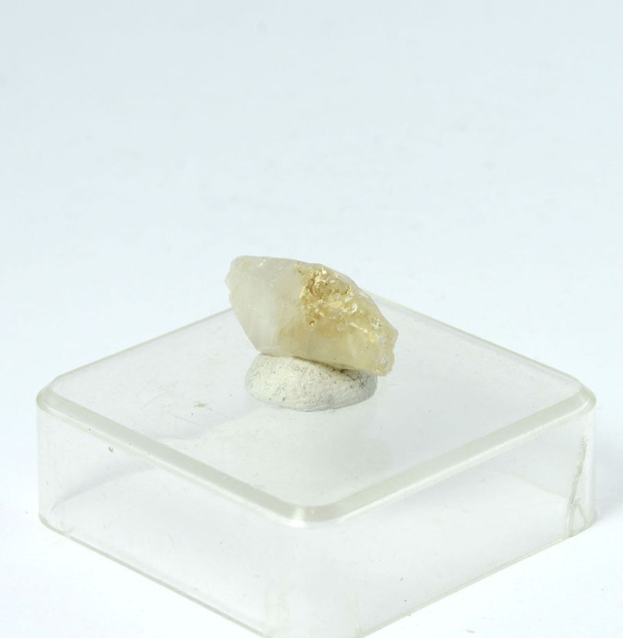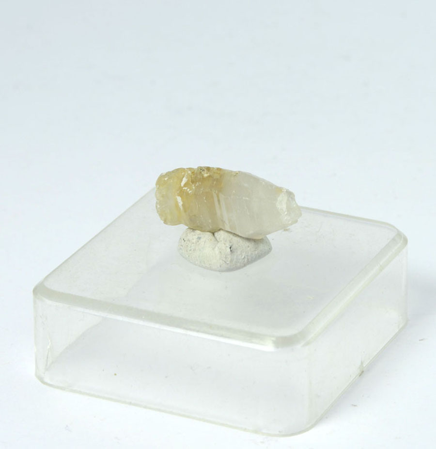 Schön ausgebildeter, transparenter Saphir-Kristall. Der Kristall ist farblich zoniert: überwiegend weiß und teilweise leicht gelblich. Dieser Saphir-Krisdtall ist ein Unikat.