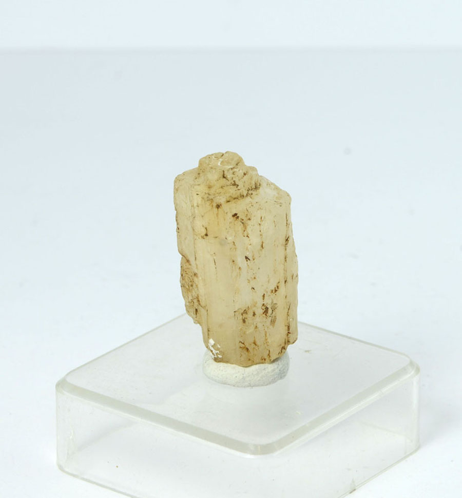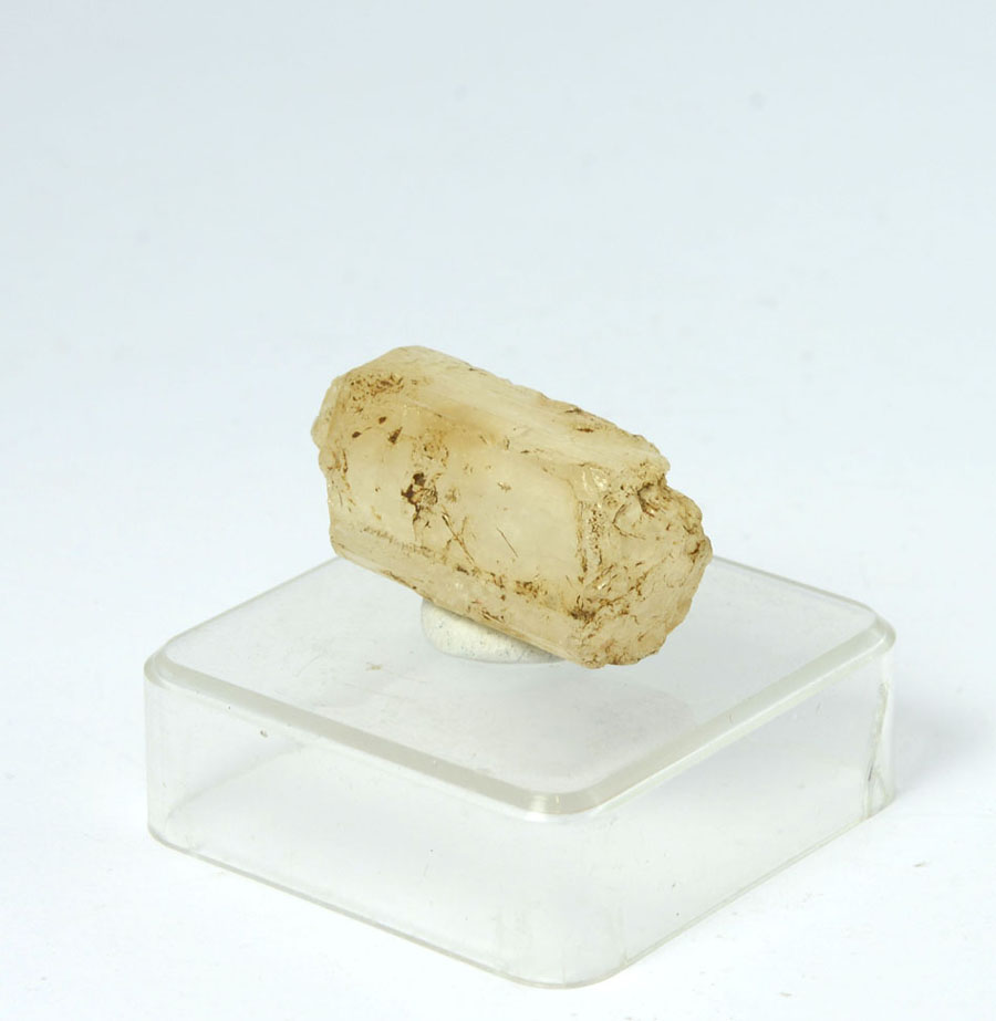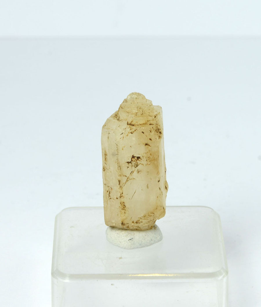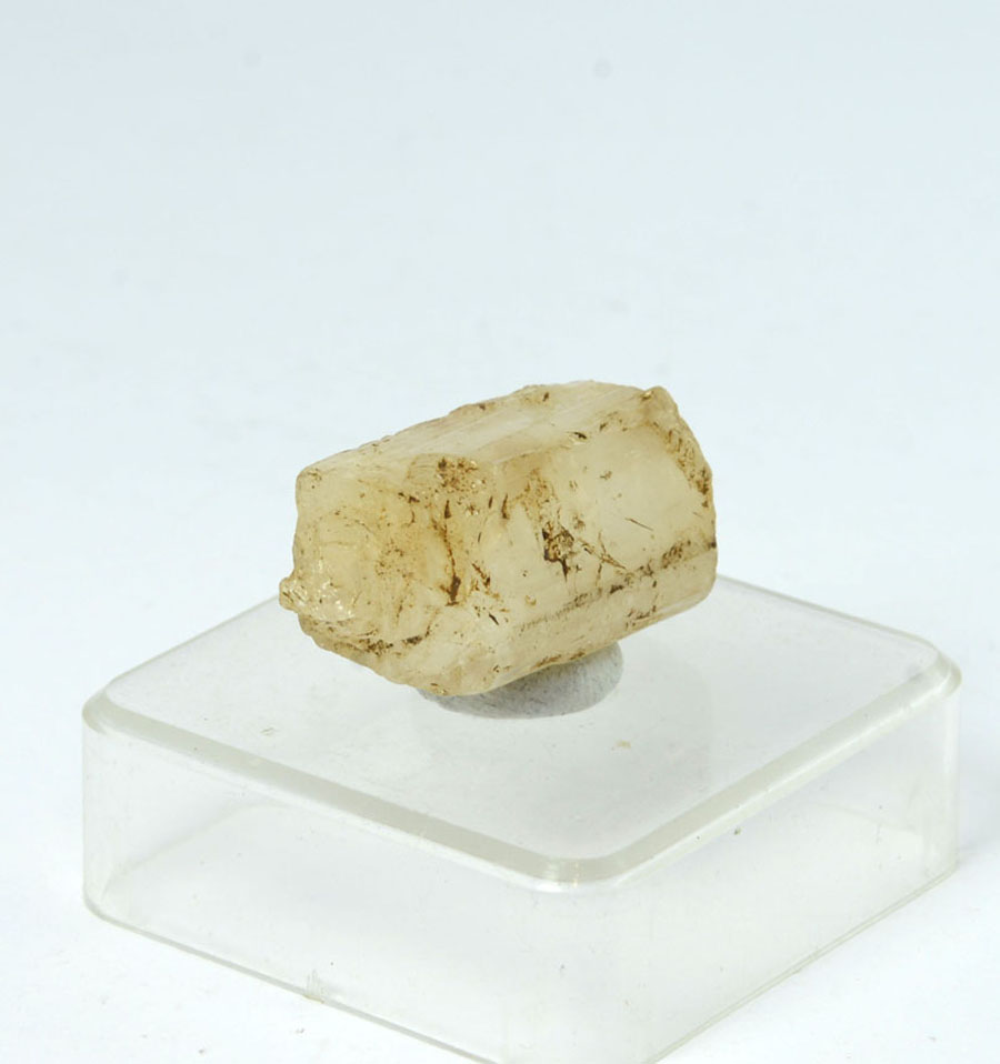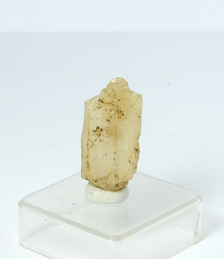 Zart gelber, durchscheinender Phenakit-Kristall mit sauberen Kristallflächen und stufiger Endfläche. Dieser Phenakit-Kristall ist ein Unikat.