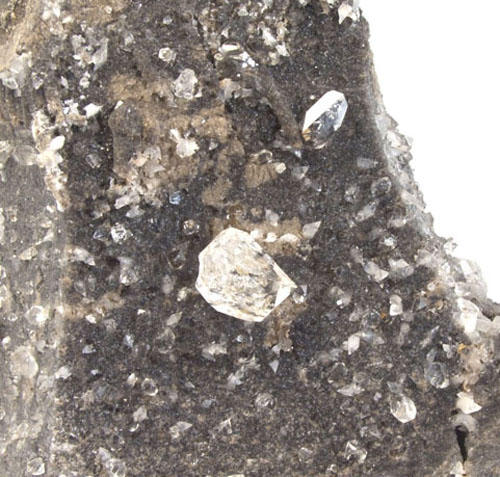 Selten: Bergkristall-Stufe mit zahlreichen klar funkelnden und einem groößeren Doppelender-Kristall aus Südfrankreich. Als Mirabeau werden Stufen bezeichnet, bei denen kleine Quarzdoppelnder-Kristalle in Septarien wachsen. Die Kristalle, von ihrem Habitus her den bekannten "Herkimer-Diamnonds" ähnelnd, sind meist sehr klar. Diese Stufe ist ein Unikat.