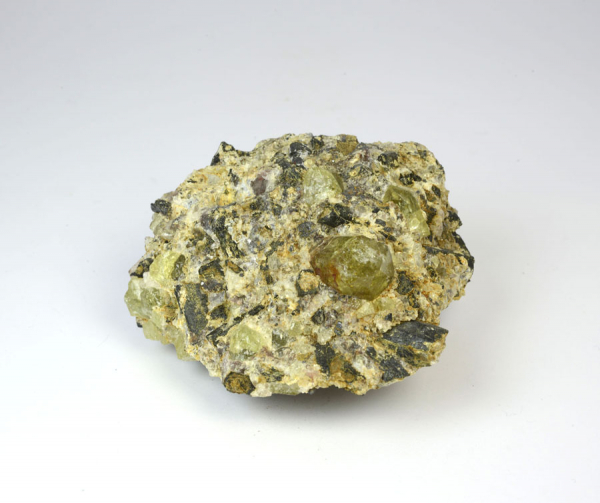 Große Stufe mit zahlreichen, gut ausgebildeten, gelbgrünen Apatit-Kristallen in Muttergestein. Diese Apatit-Stufe ist ein Unikat.