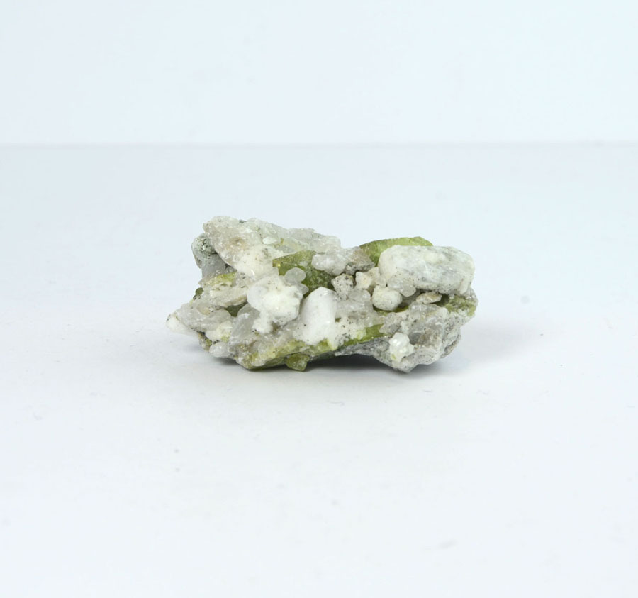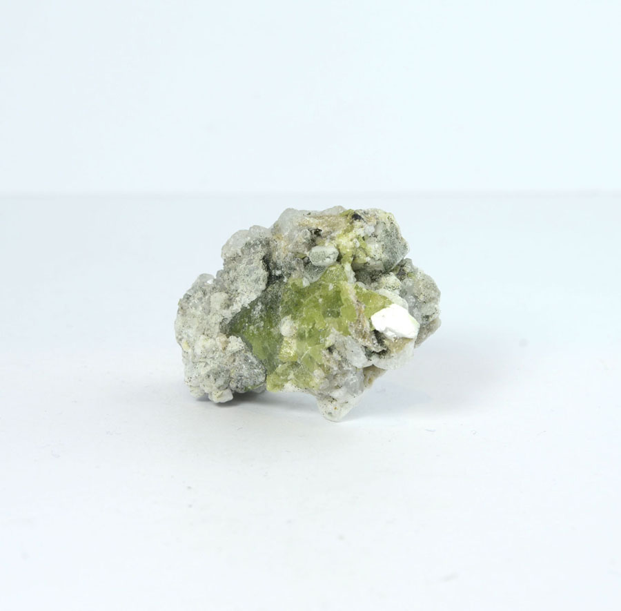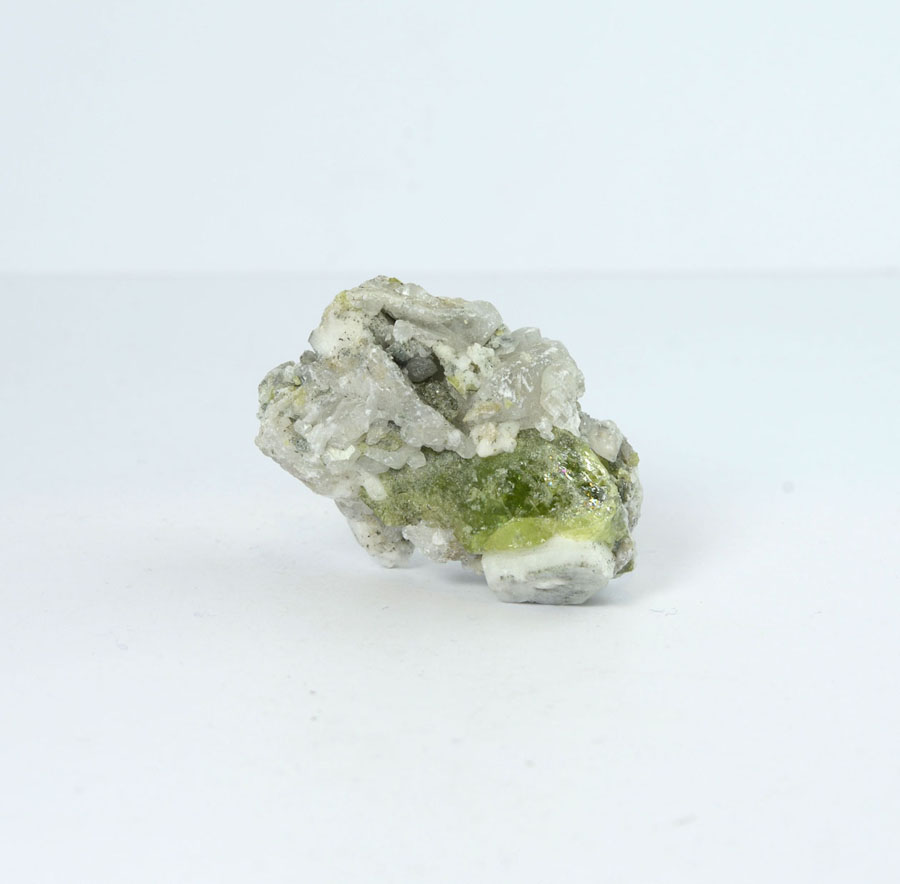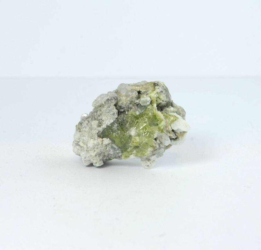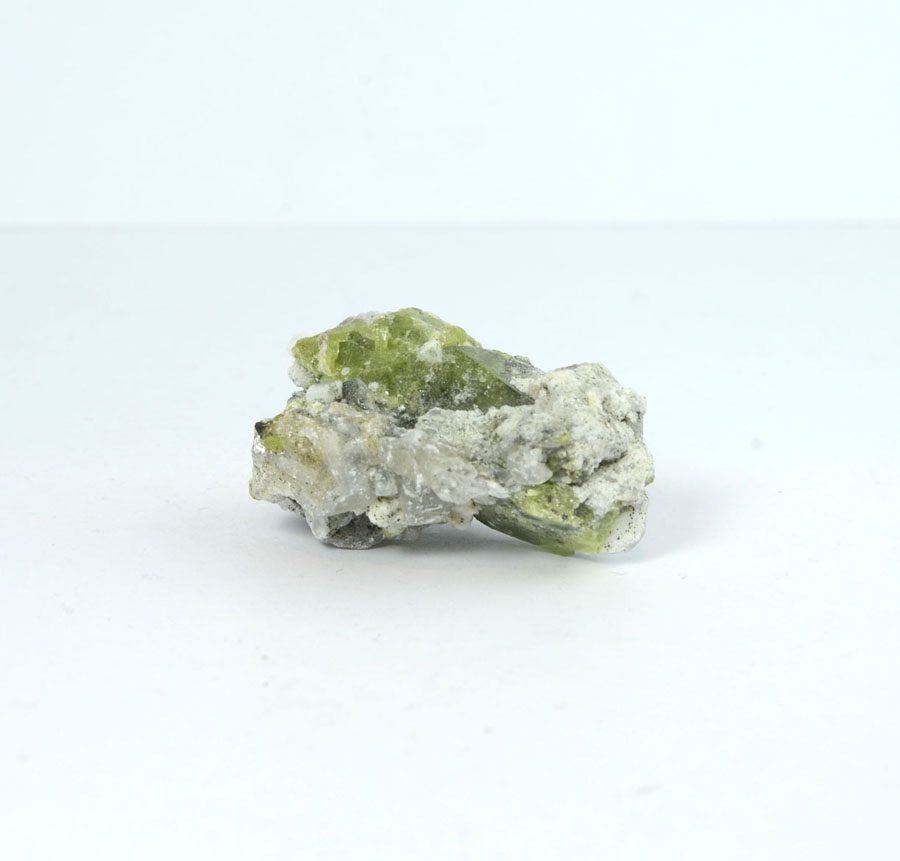 Seltene Titanit-Stufe: Die Kristalle auf hellem Muttergestein haben eine leuchtend grüne Farbe und sind sauber auskristallisiert. Diese Titanit-Stufe ist ein Unikat.