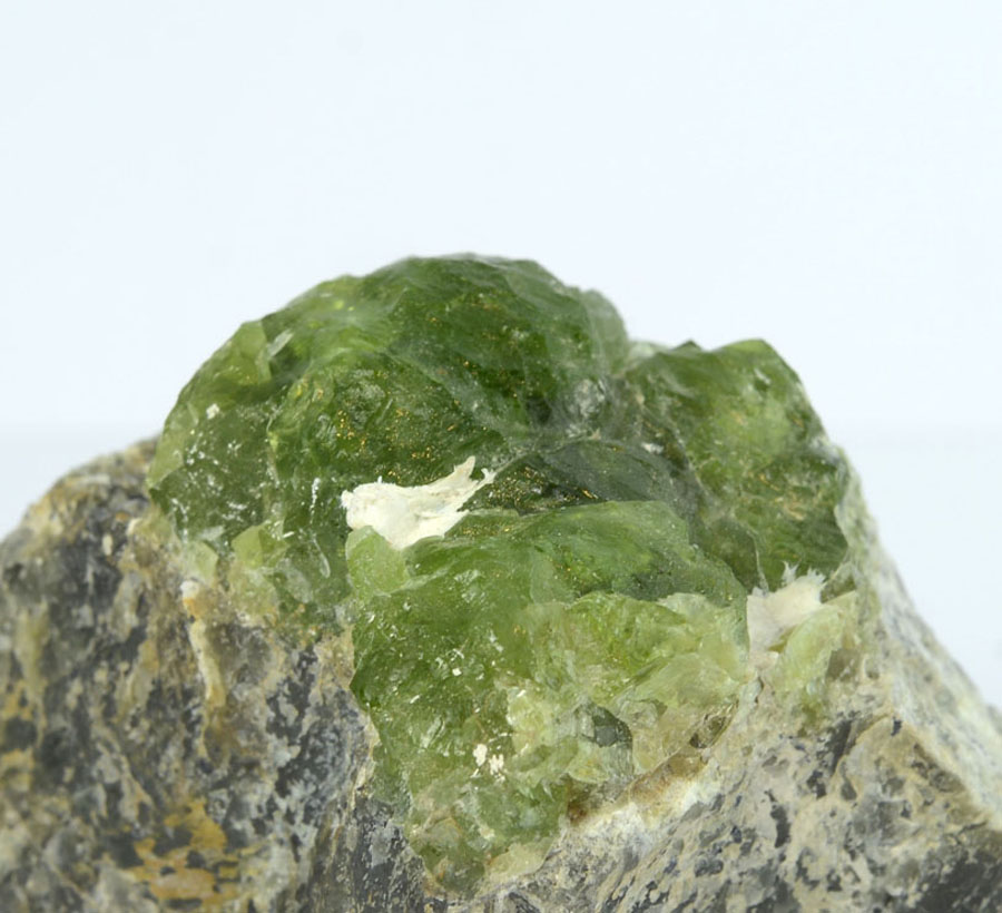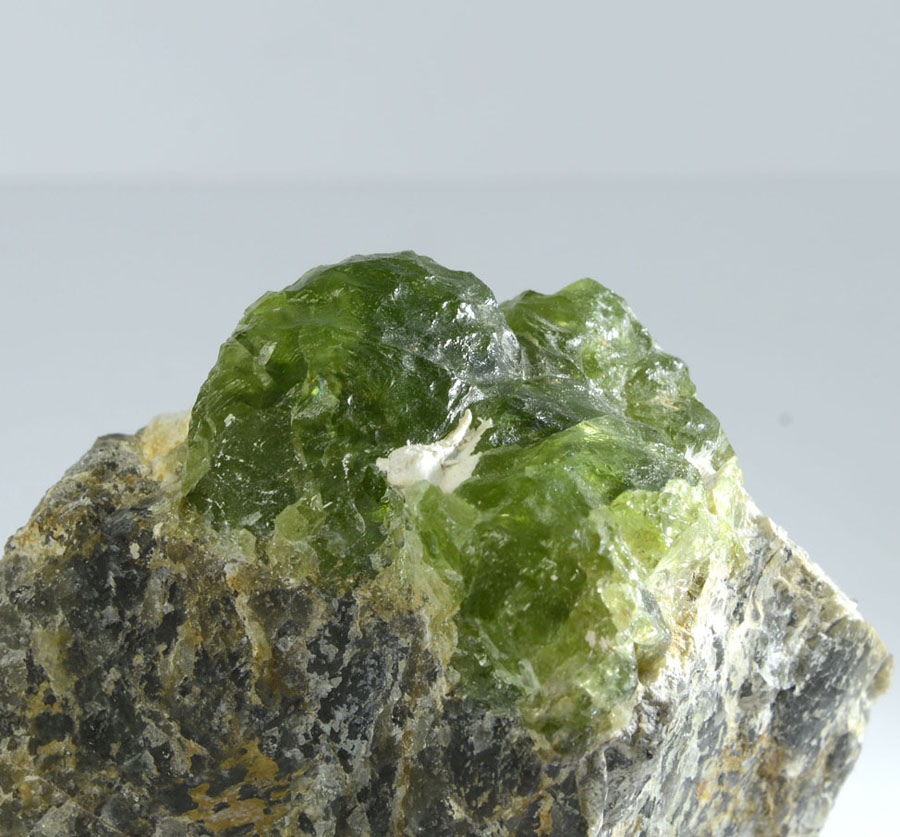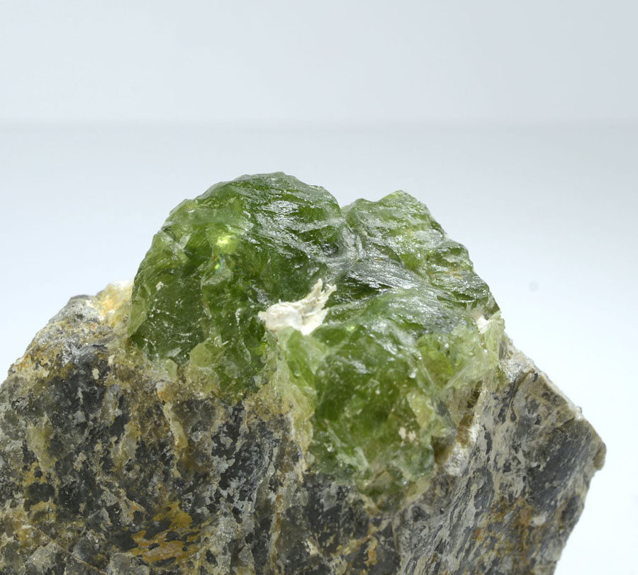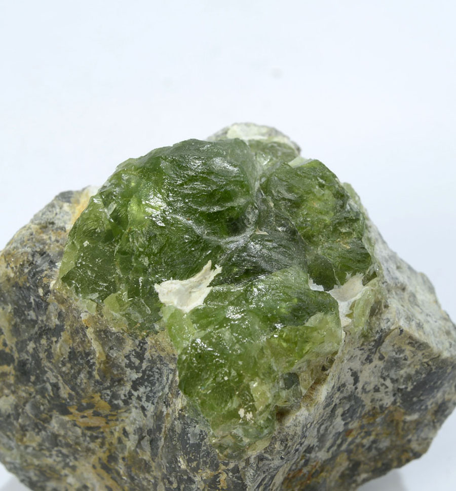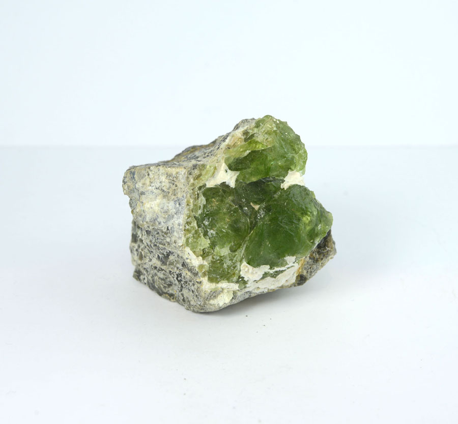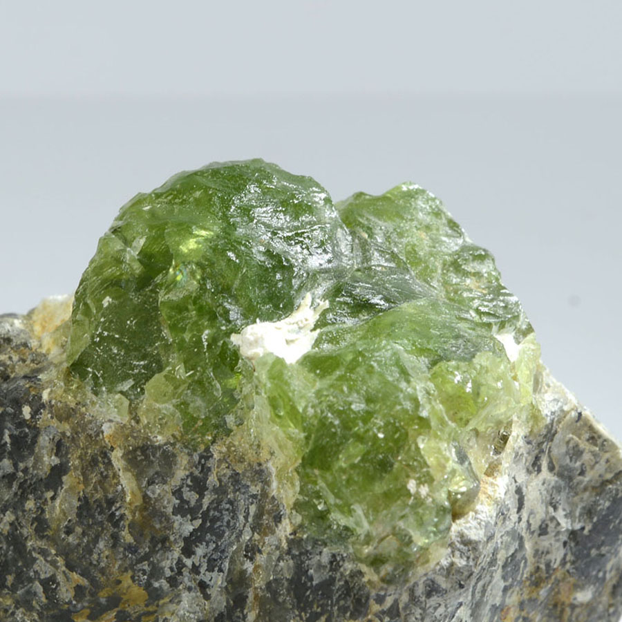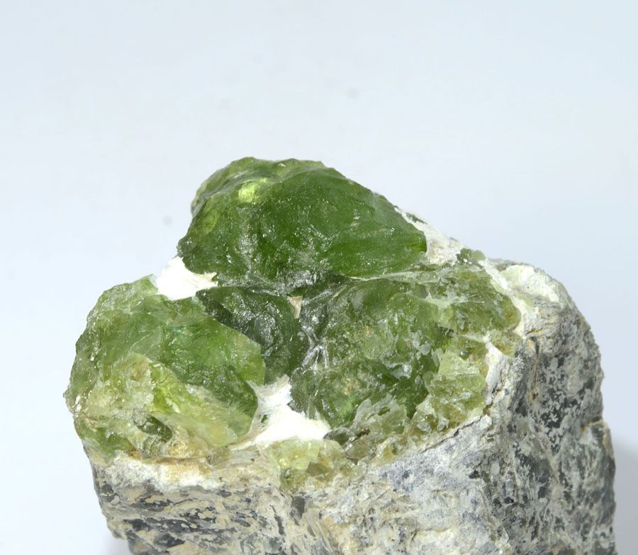 Außergewöhnliche Peridot-Stufe mit großen, leuchtend grünen Kristallen auf Muttergestein. Diese Peridot-Stufe ist ein Unikat.