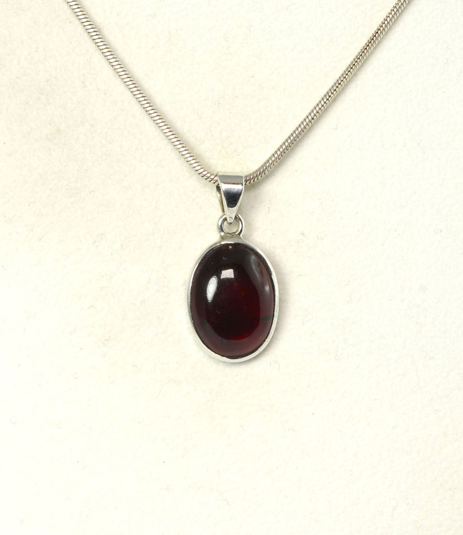 Mittelgroßer, dunkelroter Granat-Anhänger mit ovalem Cabochon, gefasst mit feinem Rand in Sterling Silber. Dieser Granat-Anhänger ist ein Unikat.
