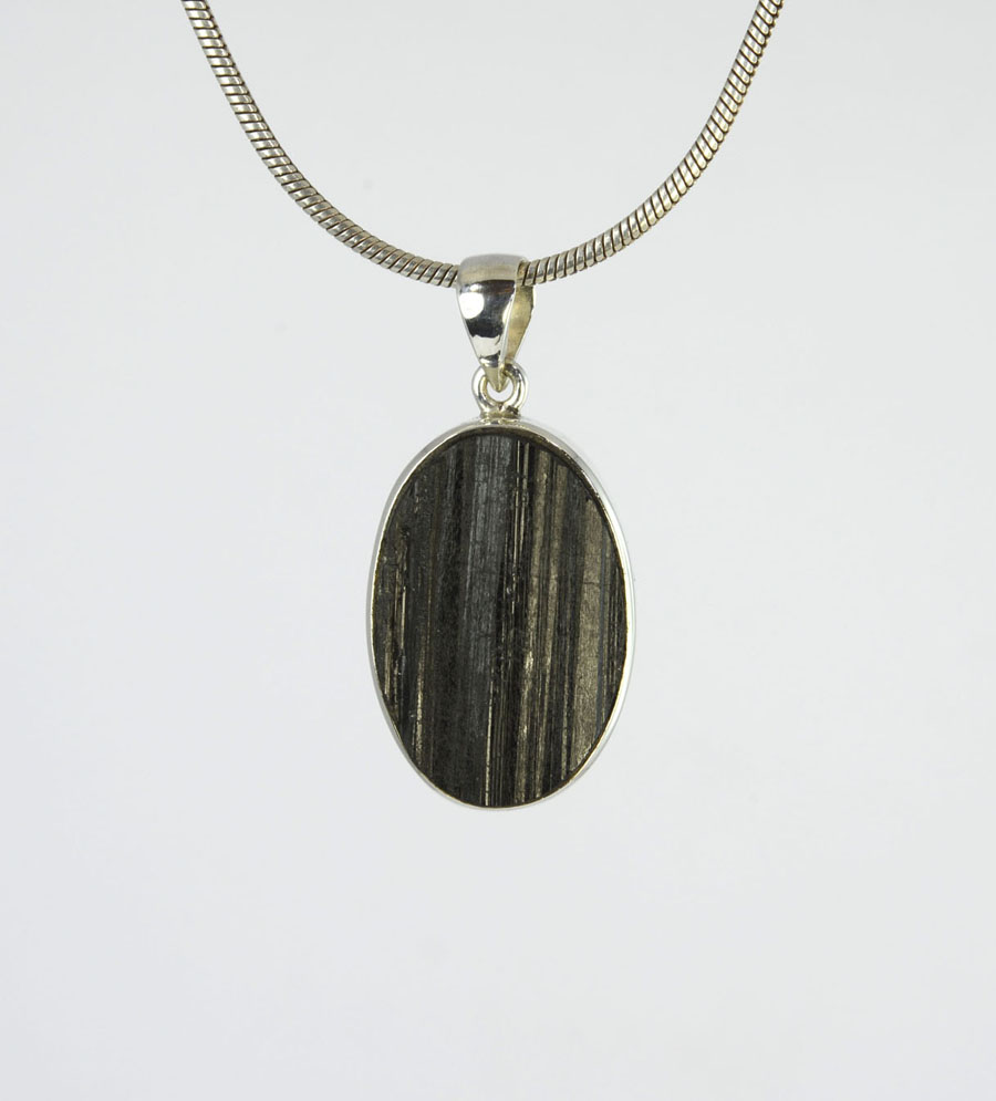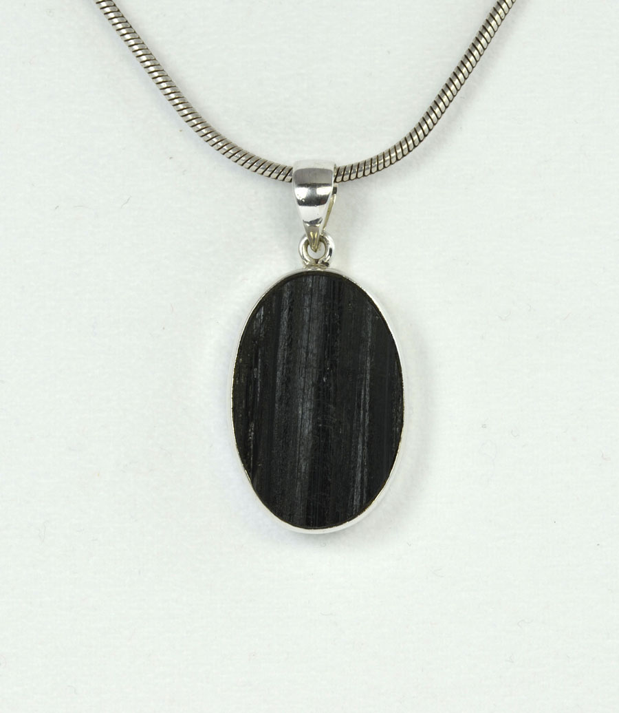 Außergewöhnlich: Schwarzer Turmalin-Anhänger mit lebendig strukturiertem, ovalem Rohstein, gefasst in Sterling Silber.