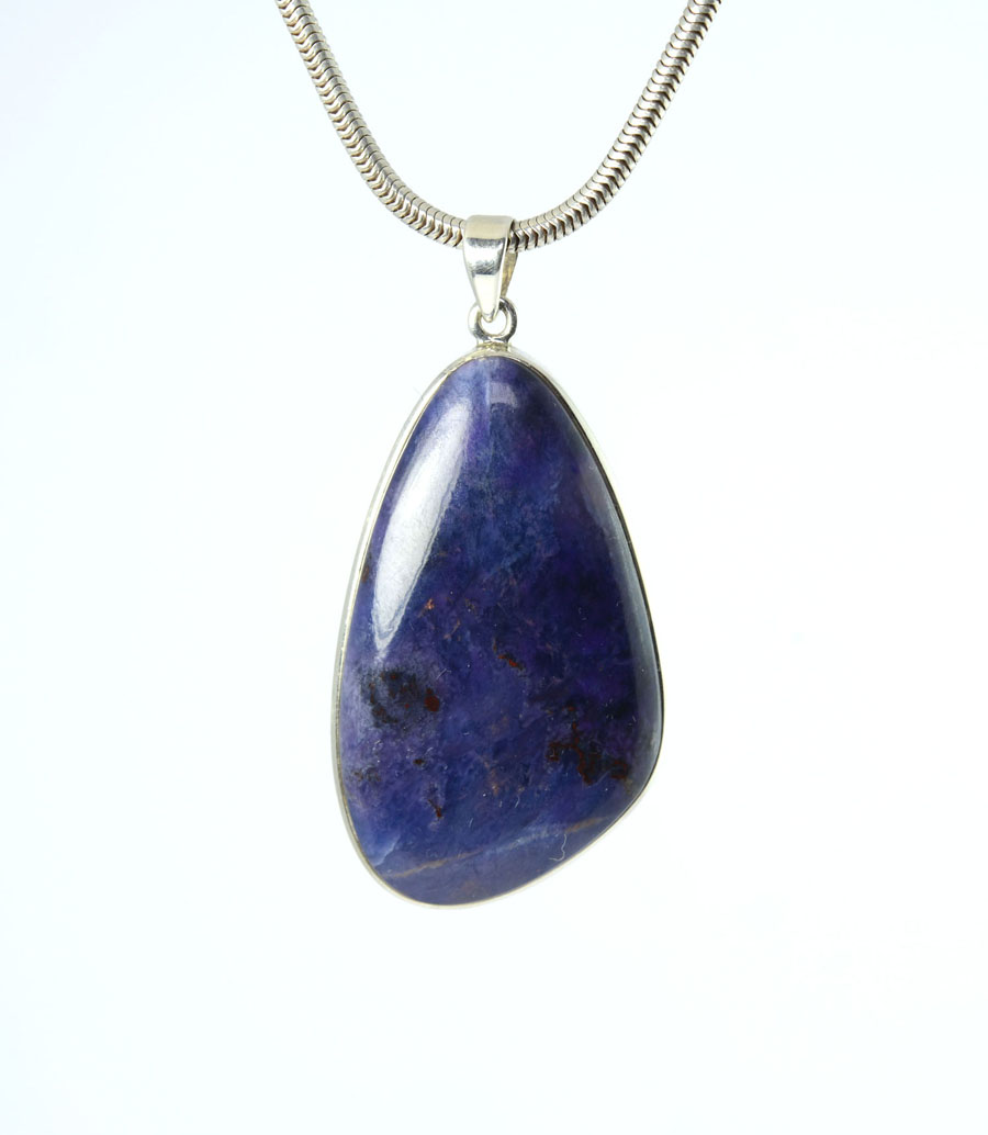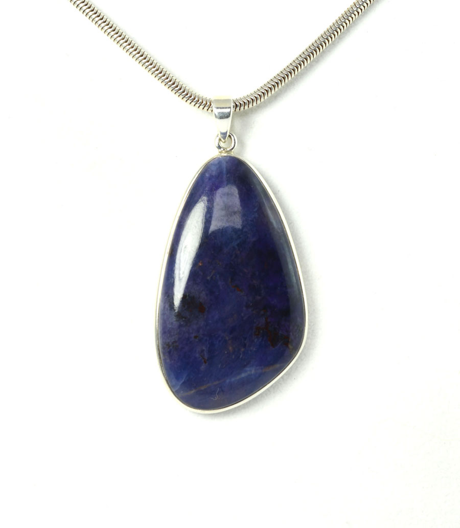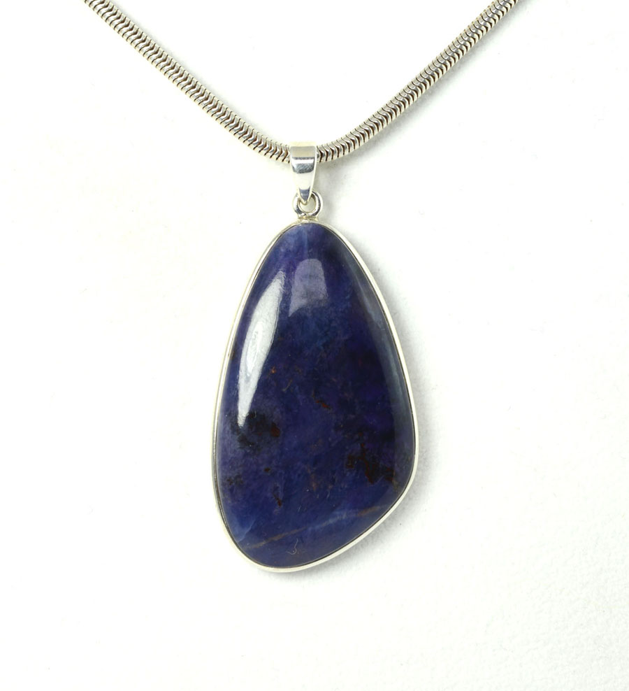 Seltener Richterit-Anhänger. Der frei geformte Cabochon hat eine lebendige Zeichnung und ist in Sterling Silber gefasst. Dieser Richterit-Anhänger ist ein Unikat.