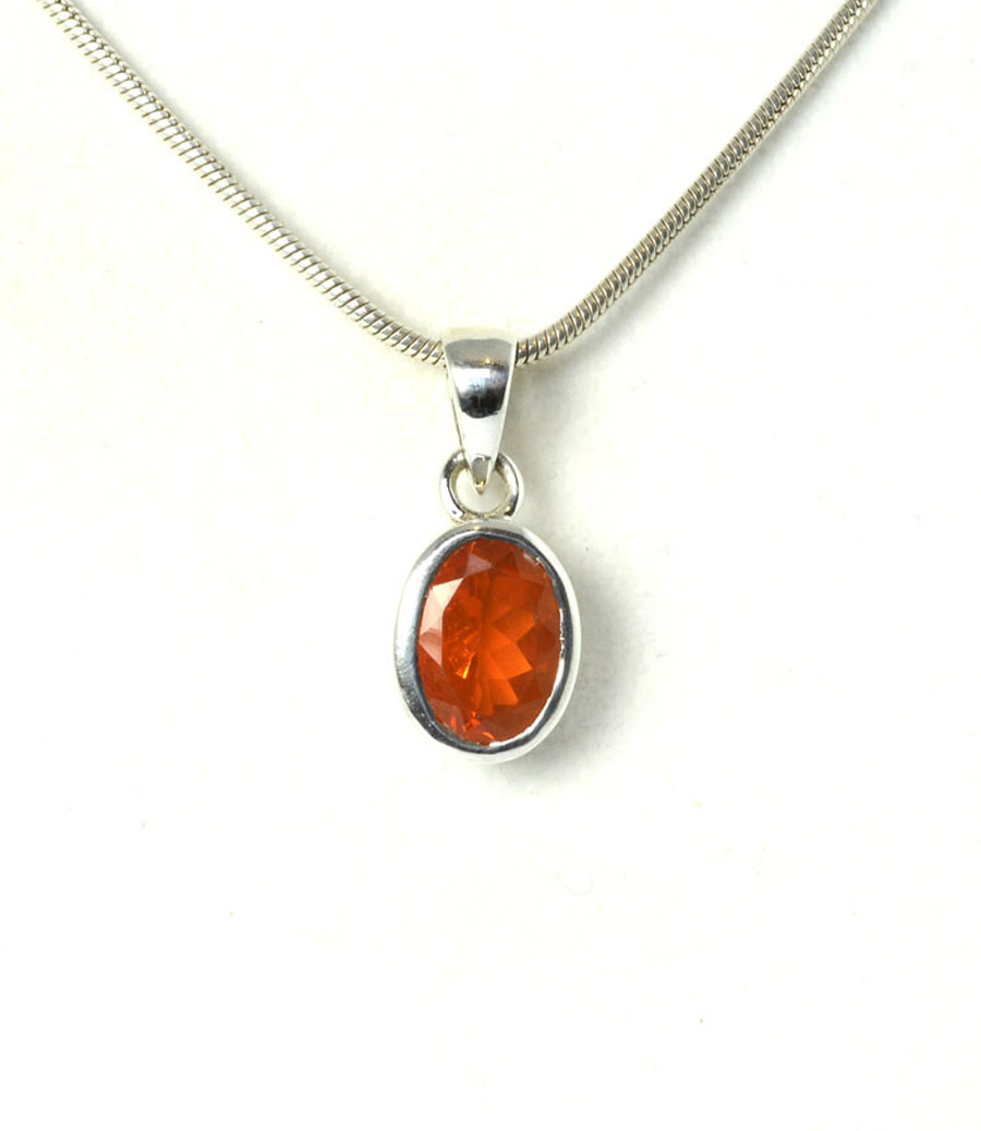 Feiner, transparenter und leuchtend oranger Feueropal-Anhänger mit ovalem, facettiertem Stein, eingefasst in Sterling Silber. Dieser Feueropal-Anhänger ist ein Unikat.
