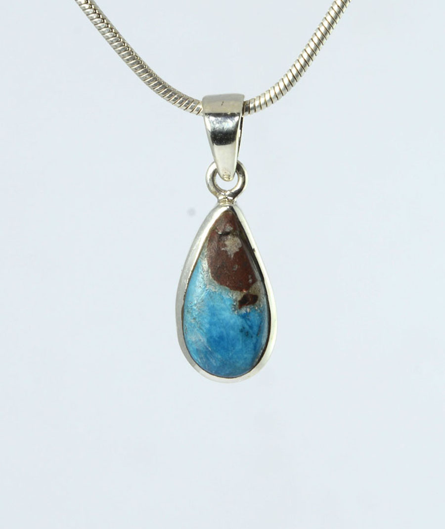 Selten - leuchtend blauer Cavansit-Anhänger in braunem Muttergestein, tropfenförmig als Cabochon geschliffen und in Sterling Silber gefasst. Dieser Cavansit-Anhänger ist ein Unikat.