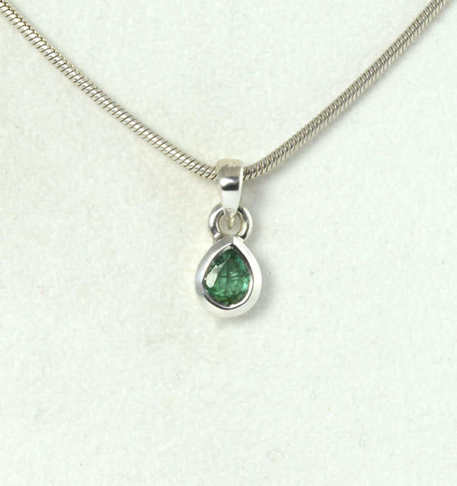 Zierlicher Smaragd-Anhänger mit einem leuchtend grünen, tropfenförmigen und facettierten Smaragd, eingefasst mit kräftigem Rand in Sterling Silber. Dieser Smaragd-Anhänger ist ein Unikat.