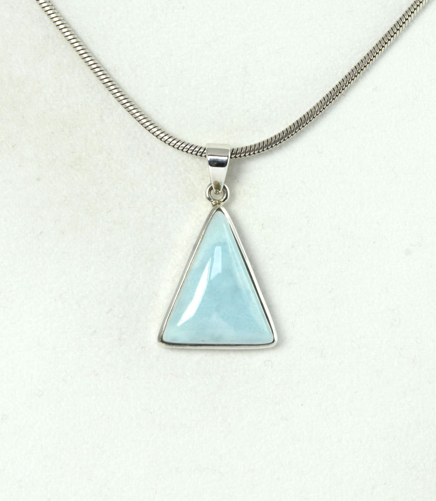 Pastellig blauer Larimar-Anhänger mit feiner Zeichnung. Der dreieckige Stein ist in Sterling Silber gefasst. Dieser Larimar-Anhänger ist ein Unikat.