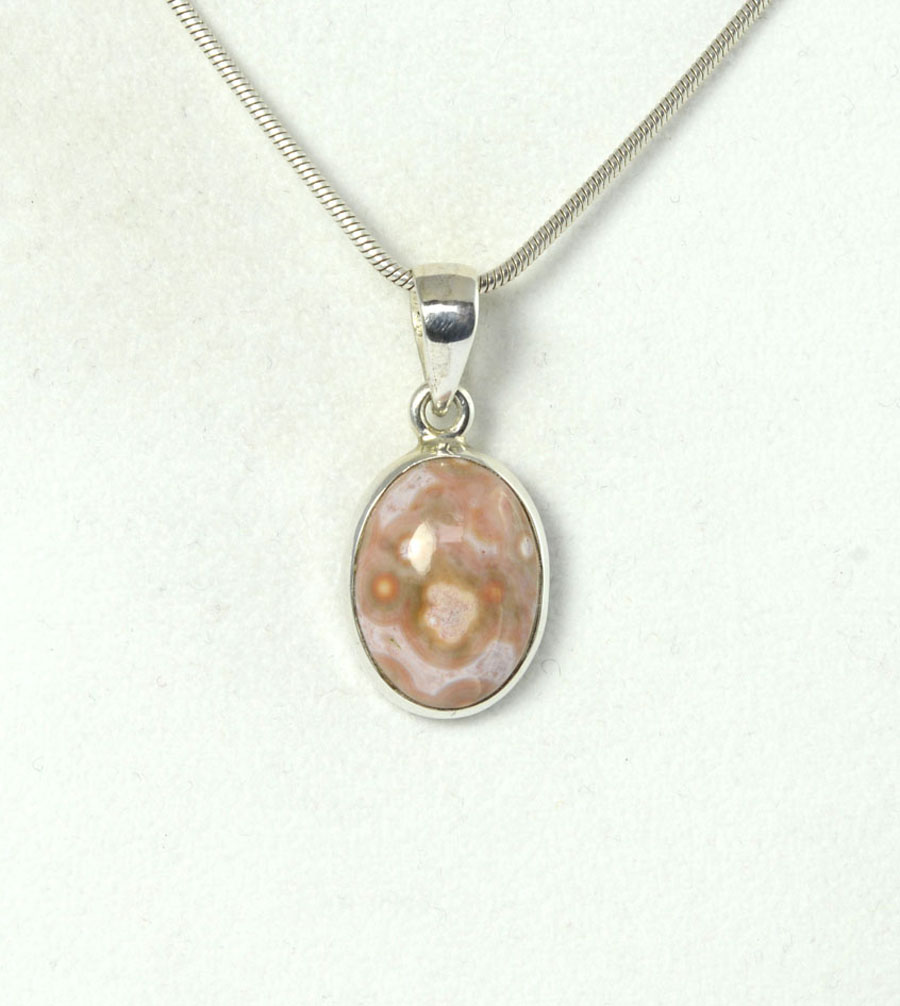 Kleiner Ozean-Chalcedon-Anhänger mit feiner Zeichnung in kräftigen Creme- und Lachstönen. Der ovale Cabochon ist in Sterling Silber eingefasst. Dieser Ozean-Chalcedon-Anhänger ist ein Unikat.