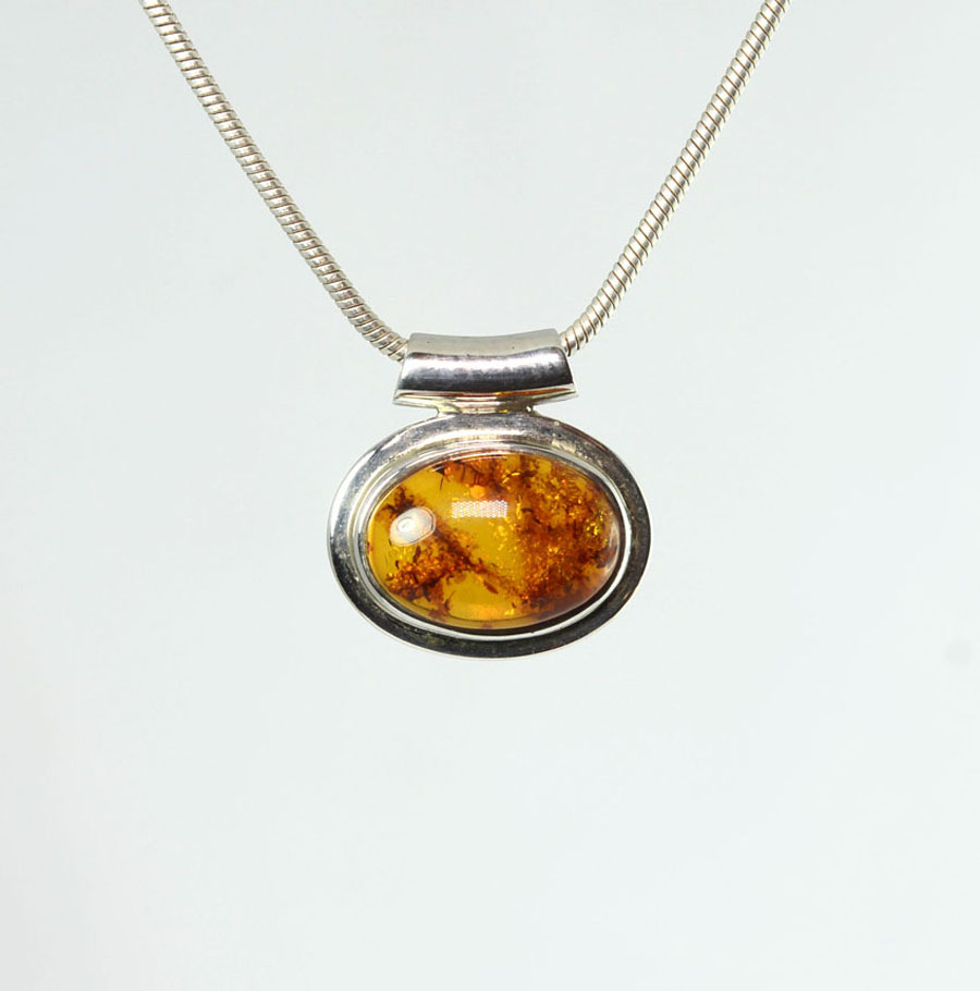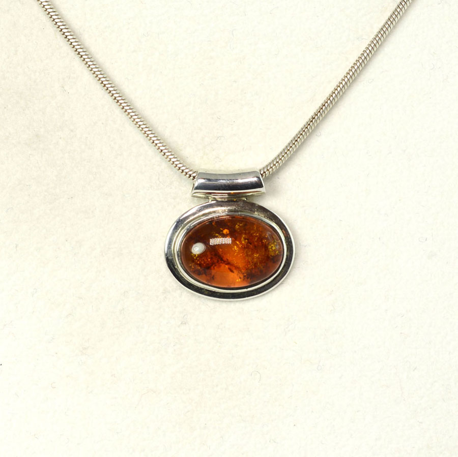 Klassiker: Anhänger mit dunkel cognacfarbenem, ovalem Bernstein. Der Cabochon ist mit breitem Rand in Sterling Silber eingefasst. Dieser Bernstein-Anhänger ist ein Unikat.