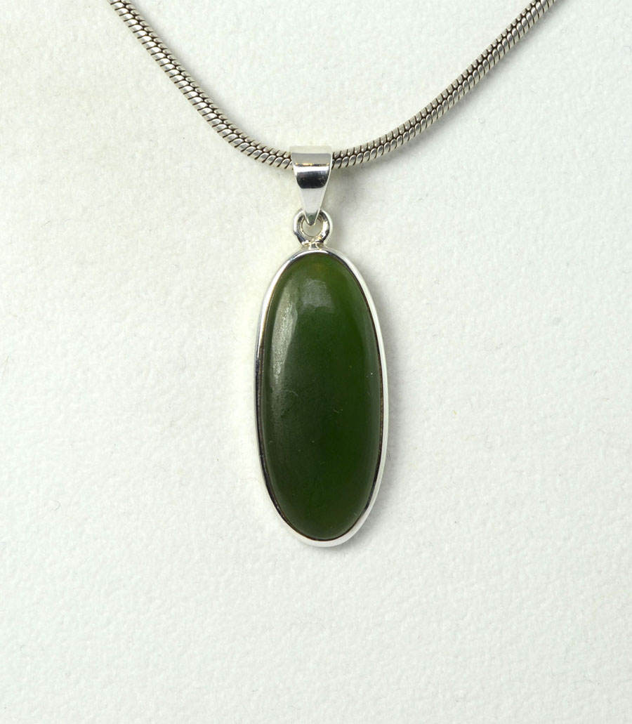Leuchtend grüner Nephrit-Jade-Anhänger mit länglich ovalem Cabochon. Der Stein hat feine Einschlüsse, ist leicht durchscheinend und eingefasst in Sterling Silber. Dieser Nephrit-Jade-Anhänger ist ein Unikat.