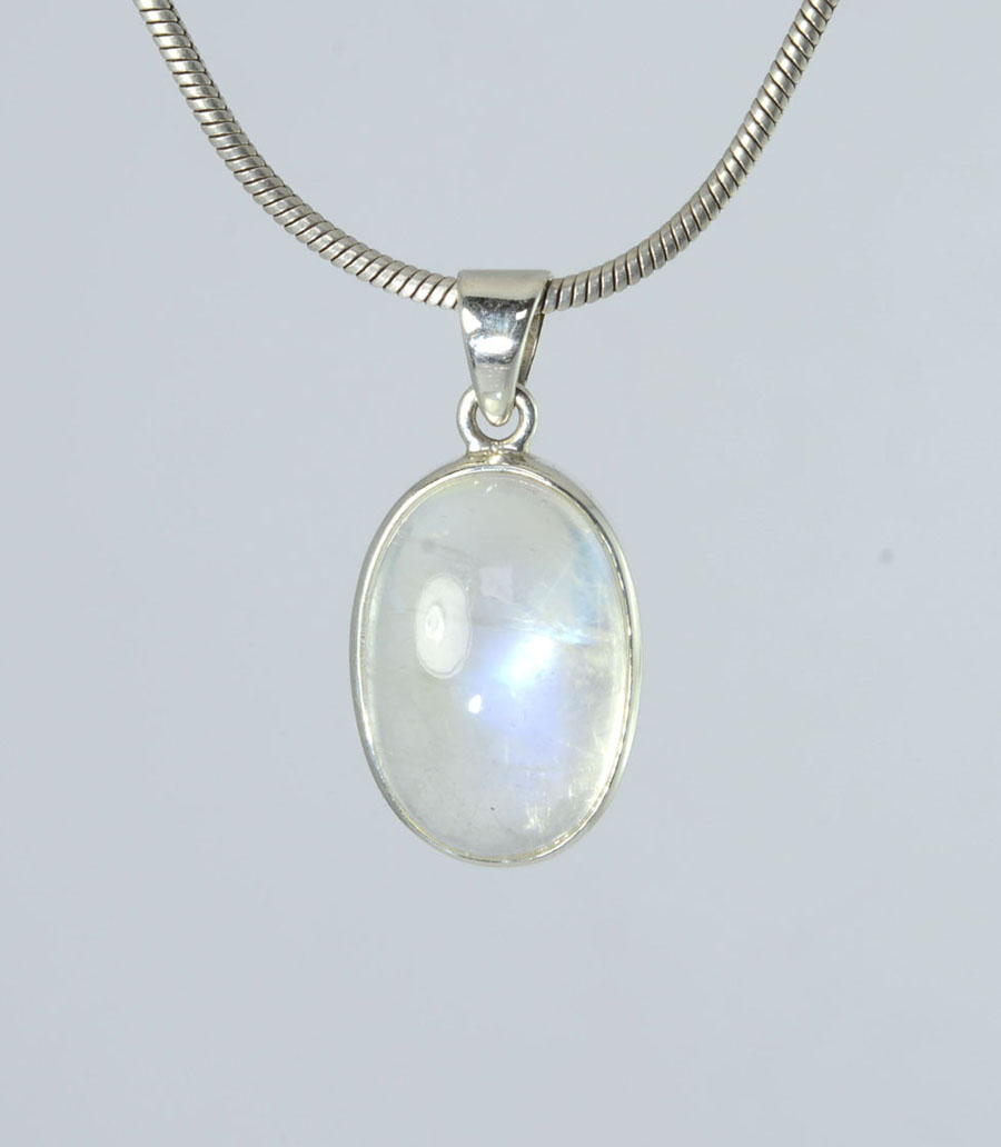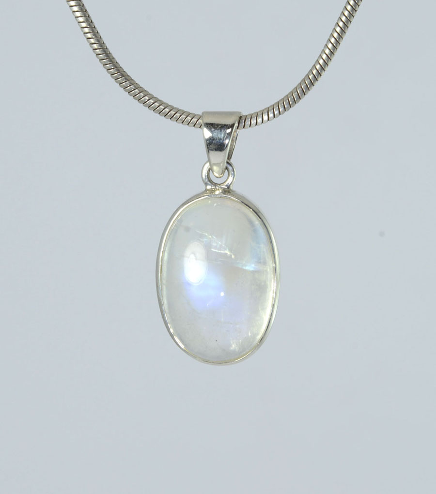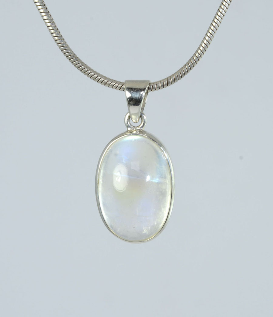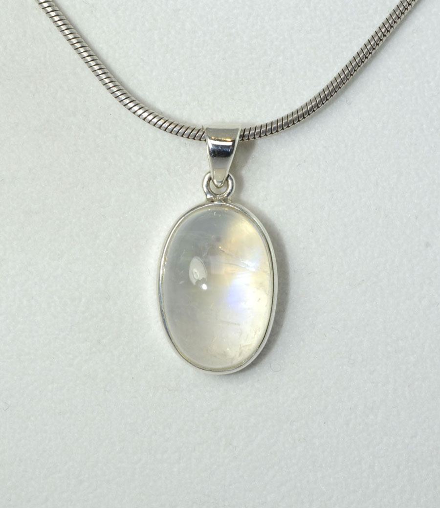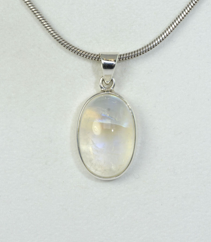 Sehr klarer Anhänger aus weißem Labradorit mit buntem Farbspiel. Der ovale, weiße Labradorit ist als Cabochon geschliffen und in Sterling Silber eingefasst. Dieser Anhänger ist ein Unikat.