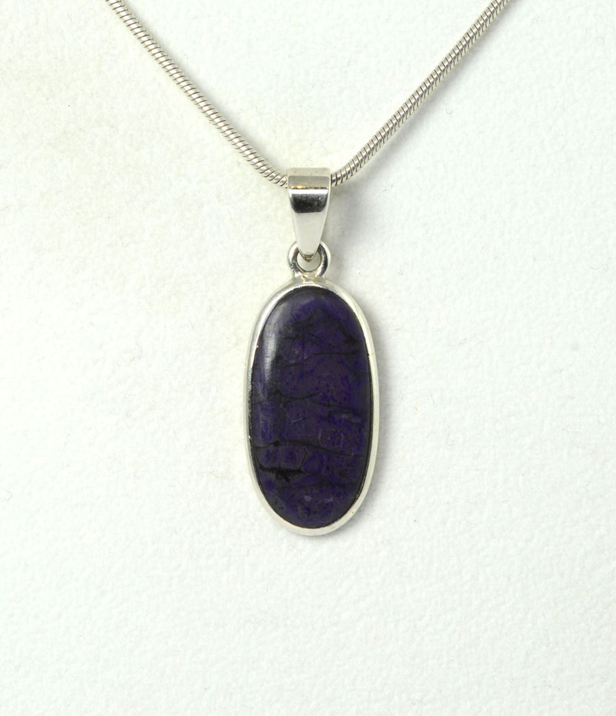 Großer Sugilith-Anhänger mit ovalem Cabochon. Der Anhänger besticht durch seine intensive, dunkel violette Farbe und ist in Sterling-Silber gefasst. Dieser Sugilith-Anhänger ist ein Unikat.