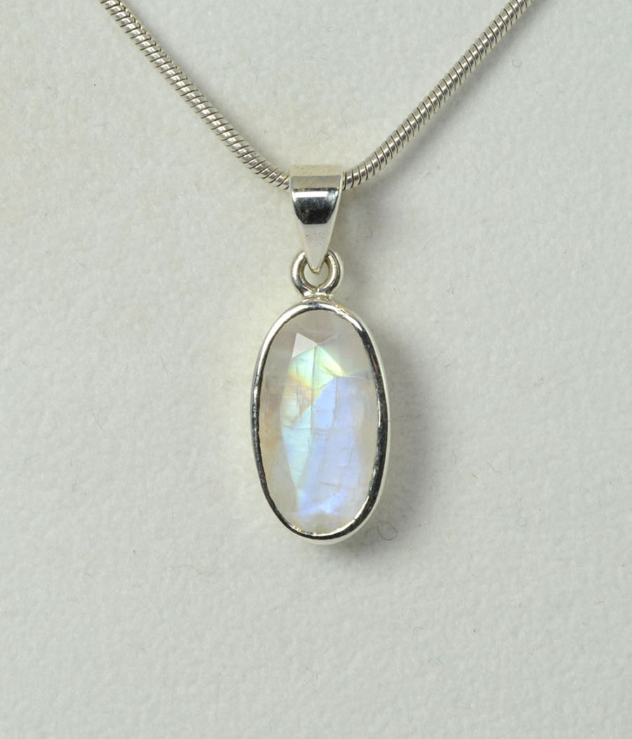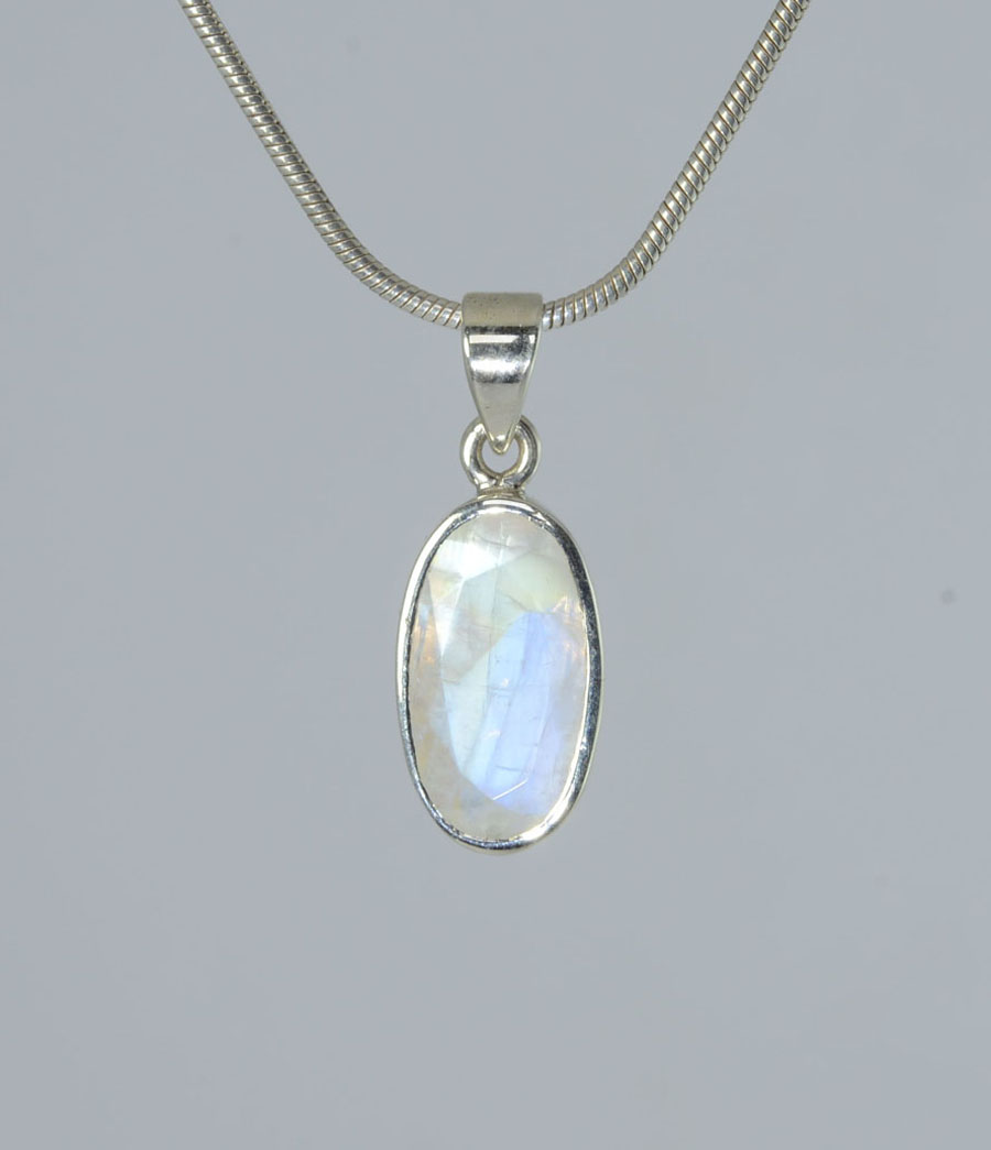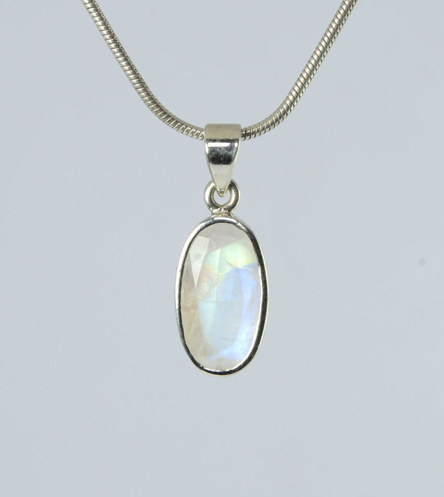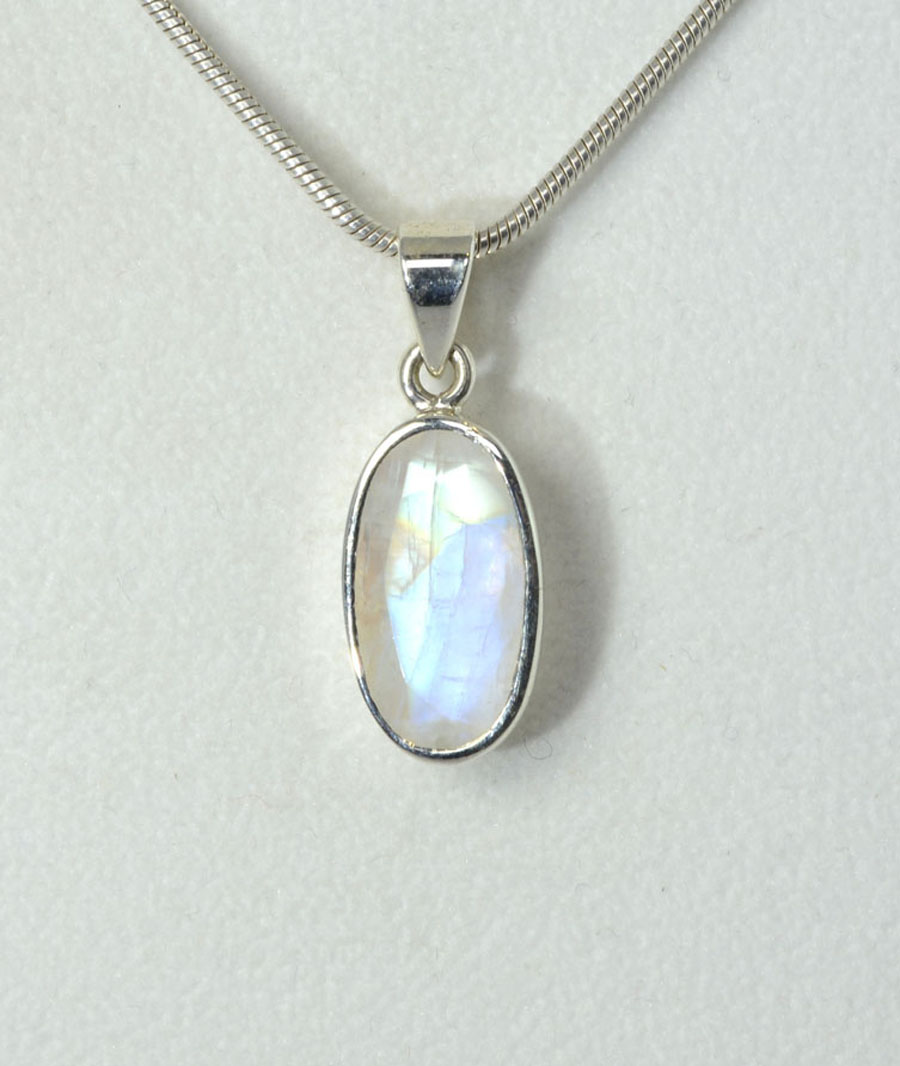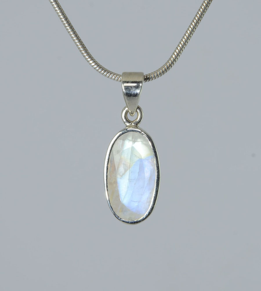 Zierlicher Anhänger aus weißem Labradorit, sehr klar und mit leuchtend blauem Schimmer. Der ovale Stein ist facettiert geschliffen und in Sterling Silber gefasst. Dieser weiße Labradorit-Anhänger ist ein Unikat.