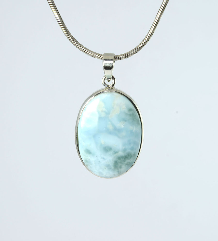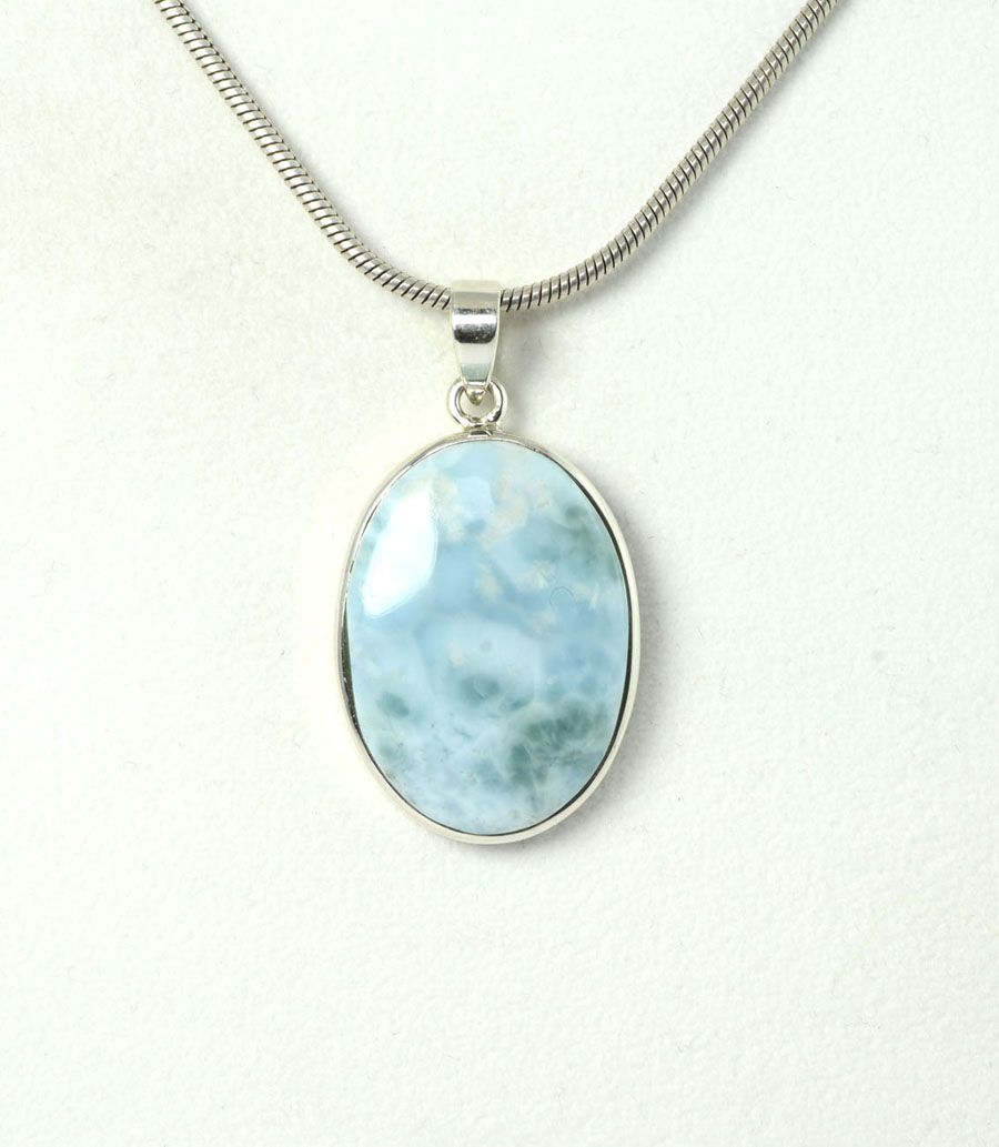 Großer, leuchtend blauer Larimar-Anhänger mit ovalem Cabochon, eingefasst in Sterling Silber. Der Anhänger hat eine kräftige Farbe und eine feine Zeichung. Dieser Larimar-Anhänger ist ein Unikat.