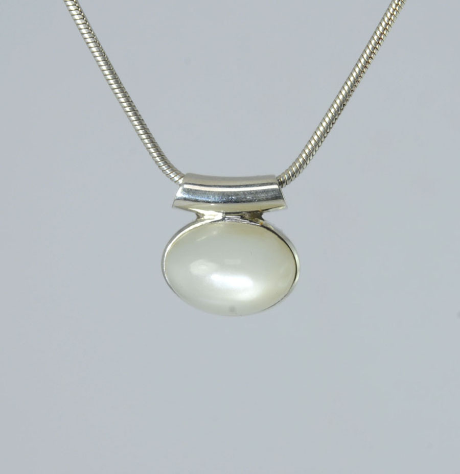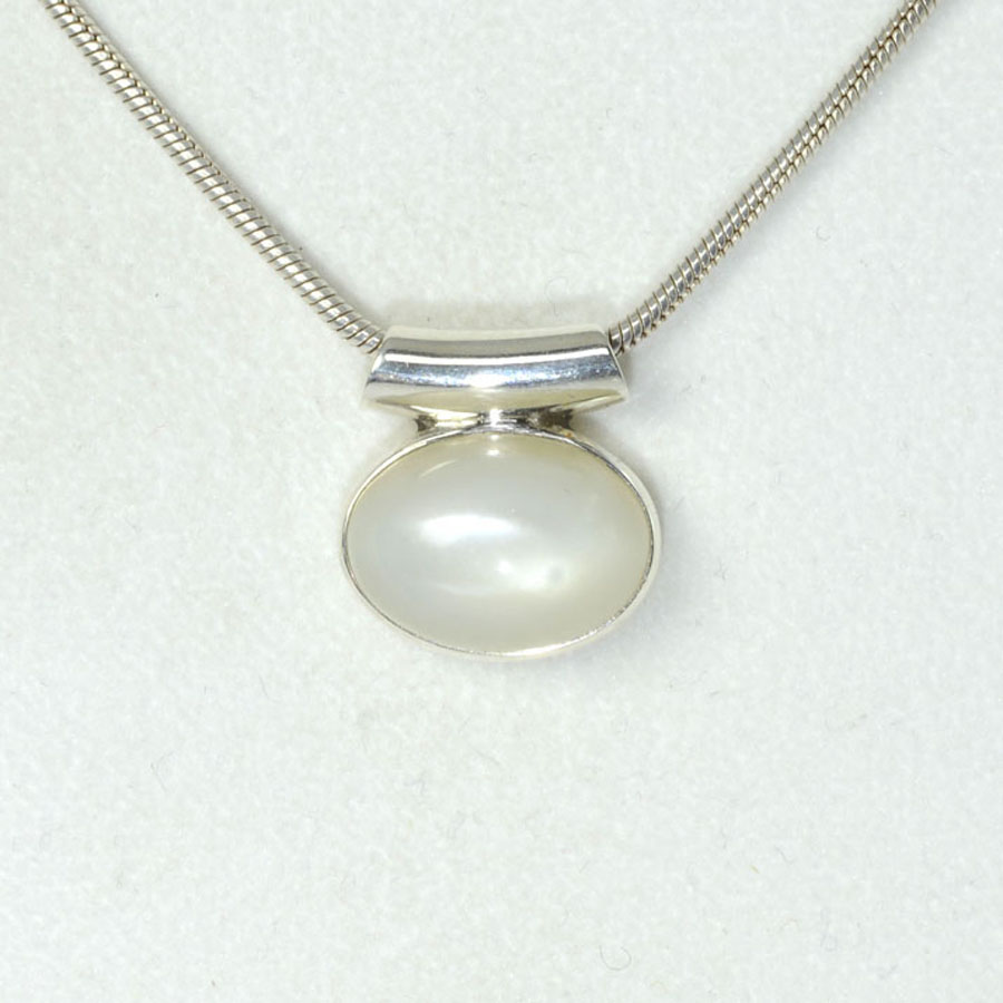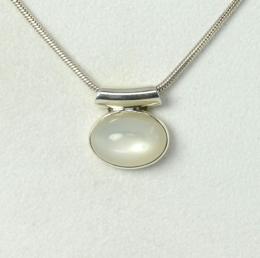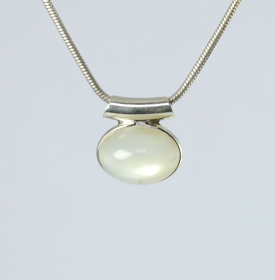 Zierlicher Mondstein-Anhänger, farblos bis weiß mit feinem, gut sichtbarem Schimmer. DerStein ist quer eingefasst in Sterling Silber. Dieser Mondstein-anhänger ist ein Unikat.