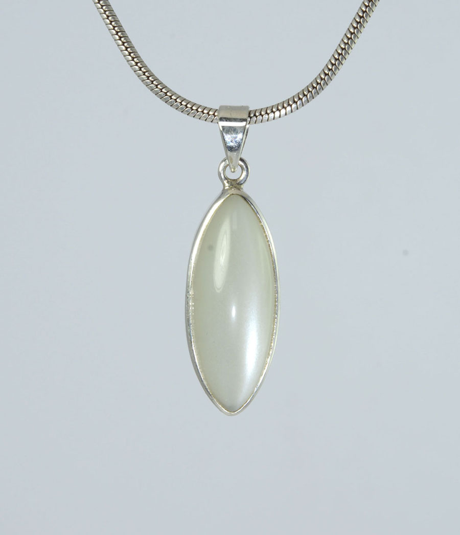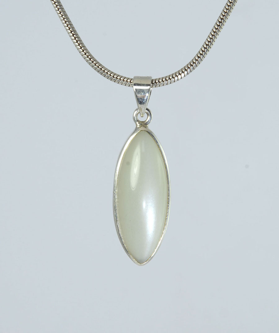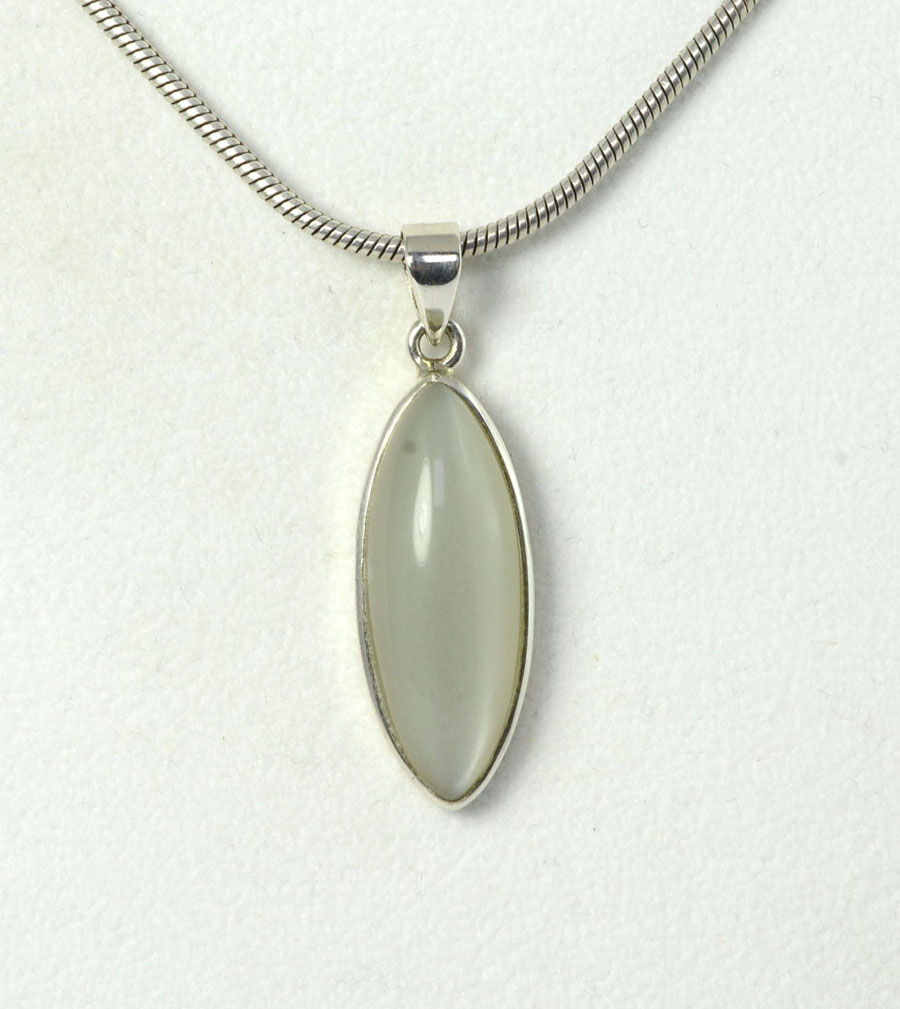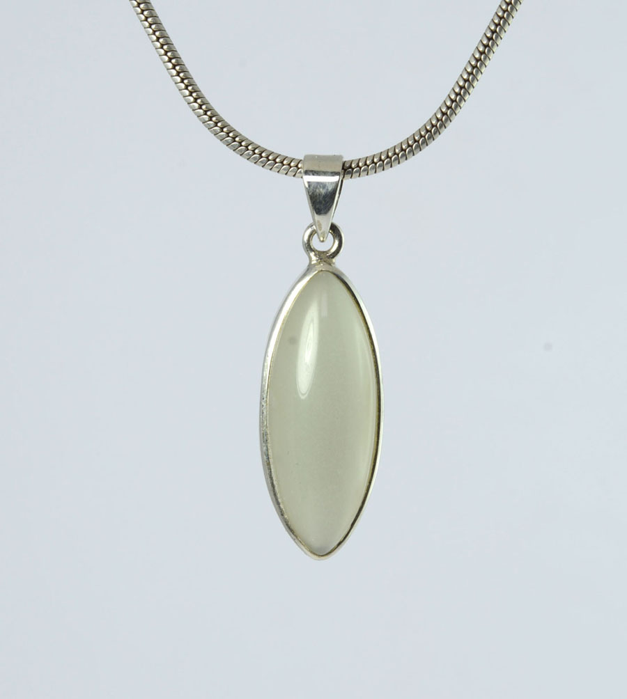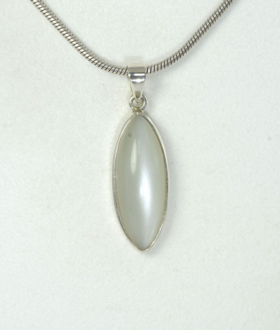 Ausgefallener Mondstein-Anhänger, weiß mit feinem Schimmer. Der navetteförmige Stein ist in Sterling Silber gefasst. Dieser Mondstein-Anhänger ist ein Unikat.