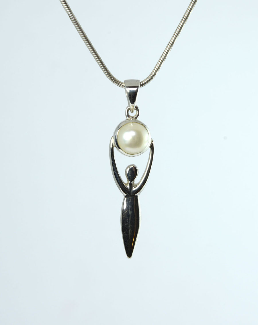 Göttin mit einer runden Perle als individueller Anhänger. Die weiße Perle hat einen feinen Schimmer und ist in Sterling Silber gefasst. Dieser Perlen-Anhänger ist ein Unikat.
