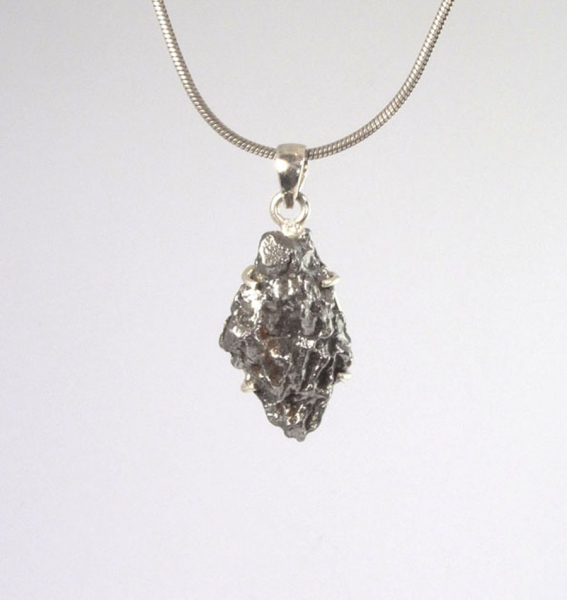 Großer Eisenmeteorit-Anhänger mit schönem Metallglanz und interessanter Oberflächenstruktur. Der Eisenmeteorit ist mit Krappen in Sterling Silber gefasst. Dieser Eisenmeteorit-Anhänger ist ein Unikat.