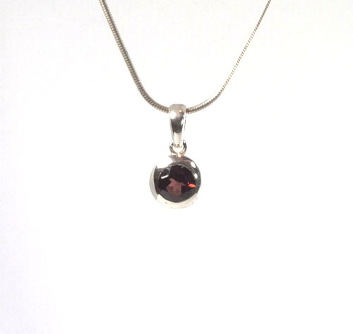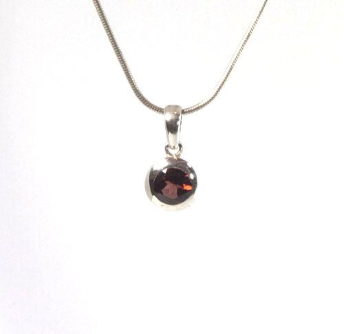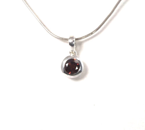 Klarer, leuchtend roter Anhänger mit einem facettierten, runden Granat Rhodolith, gefasst in Sterling Silber.